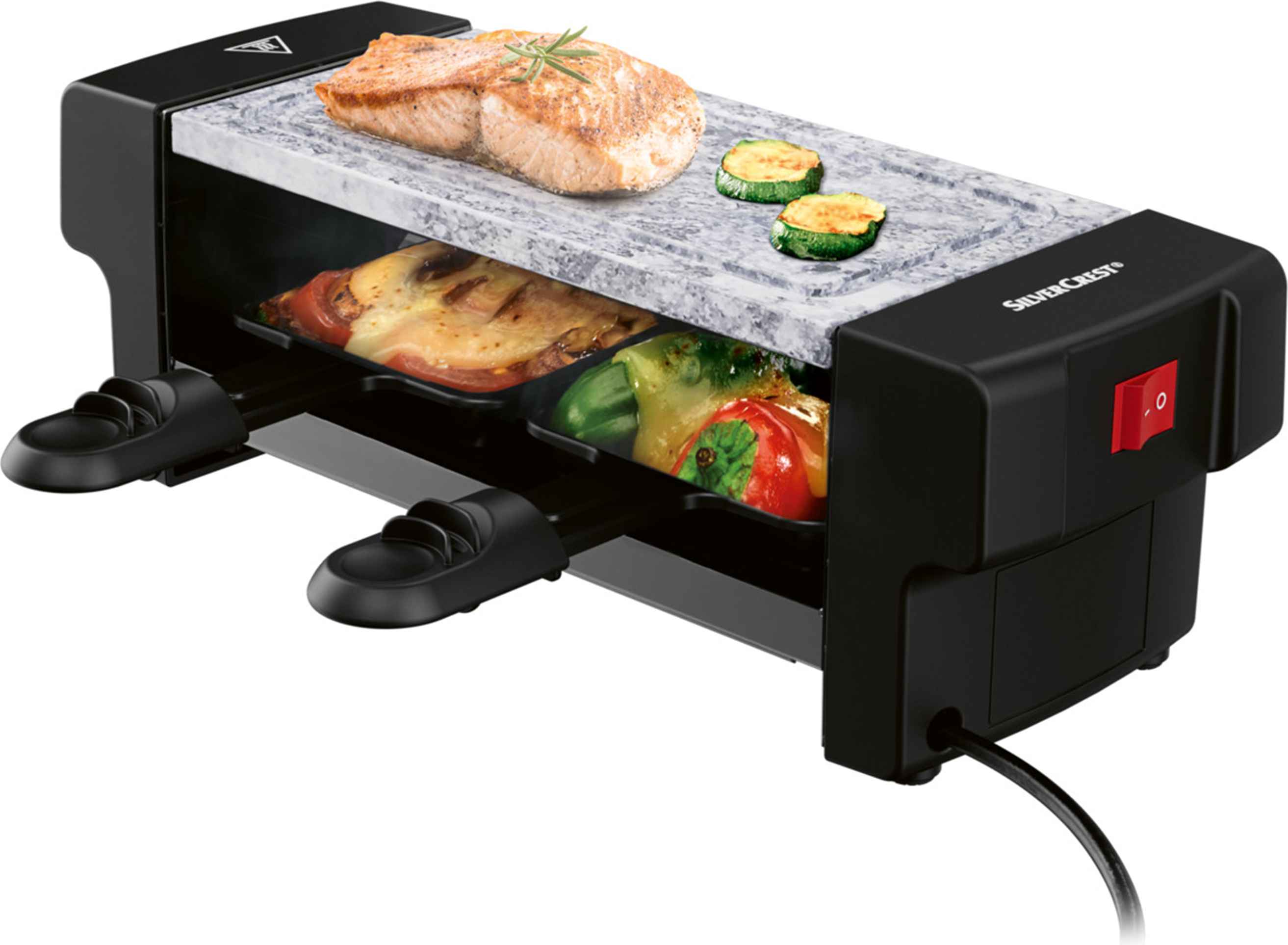 Kategorie: Raclettes - Kela - GTIN:4025457664908 - - für zwei Personen- Gehäuse schwarz- mit antihaftbeschichteter Grillplatte aus Stahl- mit zwei antihaftbeschichteten Pfännchen und zwei Nylonspateln - 19,99 Euro bei mueller.de - gefunden von billiger.de Dieses Raclette ist mit 19.99 Euro ein sehr preiswertes Angebot und ideal für Einsteiger. ![]() kaufland.d e SILVERCREST KITCHEN TOOLS Raclette für 2 Personen (mit heißem Stein)