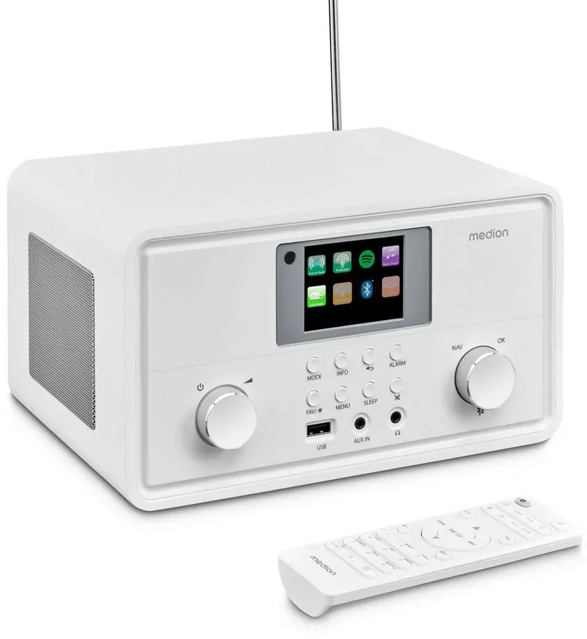 Zustand: Neu - Internet-Radios Internet Radios - MEDION - MD88069 - EAN: 4061275213430 - Stereo Internetradio mit DAB+/UKW-Radioempfang, drahtlose Anbindung durch WLAN-Technologie Empfang von über 25.000+ Internetradiosender & zahlreiche Podcasts aus aller Welt, automatischer und manueller Sendersuchlauf mit automatischer Senderspeicherung 7,1 cm (2,8€²€²) TFT-Farbdisplay (320 x 240 Pixel), Bluetooth-Wiedergabefunktion, unterstützt Spotify-Connect, MEDION LifeStream 2 APP Weckfunktion mit zwei individuell einstellbaren Weckzeiten und Schlummerfunktion (Snooze) sowie Einschlaffunktion (Sleep Timer) Lieferumfang: MEDION LIFE MD88069 P85027 Internetradio mit DAB+, Fernbedienung inkl. Batterien, Netzadapter, Bedienungsanleitung, karte - 3 Händler im amazon.de Marketplace ![]() ![]() MEDION P85027 Internetradio (DAB Plus, UKW Radio, Spotify Connect, WLAN, Bluetooth, Streaming, Equalizer, Farbdisplay, USB, AUX, Wecker, Schlummerfunktion, Sleep Timer) weiß
