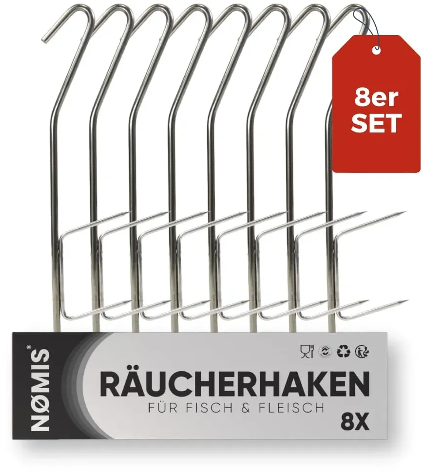 Zustand: Neu - 55,96 € / m - Räuchermaterial - NØMIS - - EAN: 4260718080534 - œ PREIS-LEISTUNGS-SIEGER: Unser 8er Set aus Räucherhaken bietet unschlagbare Qualität zum erschwinglichen Preis. œ PERFEKT ZUM RÄUCHERN: Perfekt für Fleisch und Fisch - Räuchere Deine Lieblingsspeisen in deinem Räucherofen wie ein Profi. œ PREMIUM EDELSTAHL: Unsere Fleischerhaken sind aus hochwertigem Edelstahl gefertigt, langlebig und leicht zu reinigen. œ BELIEBT BEI ANGLERN: Ob Forelle, Saibling, Lachs, Makrele, Aal uvw. - Die Räucherhaken sitzen einfach perfekt. Auch Fleisch sitzt perfekt auf der S Haken Alternative. œ 100% ZUFRIEDENHEIT: Uns ist wichtig, dass Du eine gute Räuchergebnisse mit unserem Räucherhaken hast. Lass uns wissen, wenn Du Fragen hast. Wir helfen immer gerne! Guten Appetit! - Verkäufer: DEUTSCHE MARKE im amazon.de Marketplace ![]() ![]() grill-jaeger Grill-Jäger Räucherhaken Doppelhaken 10 Stück | 21 cm Edelstahl | Fisch- & Fleischhaken für Räucherofen & Smoker