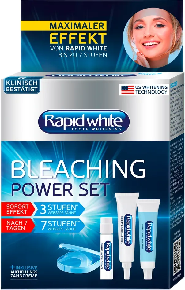 Kategorie: Zahnpflegeartikel - Rapid White - GTIN:4045612009764 - Das Rapid White Bleaching Power Set ist fr sofortige Zahnaufhellung ohne Wasserstoffperoxid geeignet. Mit maximalem Effekt bis zu 7 Stufen. It's time to smile. Ein Lcheln ist unumstritten die schnste Art Zhne zu zeigen. Oftmals jedoch hinterlassen Genussmittel wie Kaffee und Tee unschne Verfrbungen auf dem Zahn. Das leistungsstarke Rapid White Bleaching Power Set ermglicht um bis zu sieben Stufen weiere Zhne. Mit dem Set werden die Zhne leicht und unkompliziert im Do-it-yourself-Verfahren wieder weier. Ein wirksames Verfahren, das fr den bequemen Einsatz Zuhause geeignet ist. Ohne zeit- und kostenintensiven Zahnarztbesuch kannst Du Deine Zhne von Zuhause aus zum Strahlen bringen. Das Rapid White Bleaching Power Set berzeugt mit seiner maximalen Performance und beeindruckendem Doppele - 14,95 Euro bei HAGEL-SHOP - gefunden von billiger.de Dieses umfassende Zahnaufhellungs-Set enthält alles, was für eine effektive Zahnaufhellung benötigt wird, einschlieÃ?lich Beschleuniger, Bleichgel und Zahnpasta. ![]() ![]()