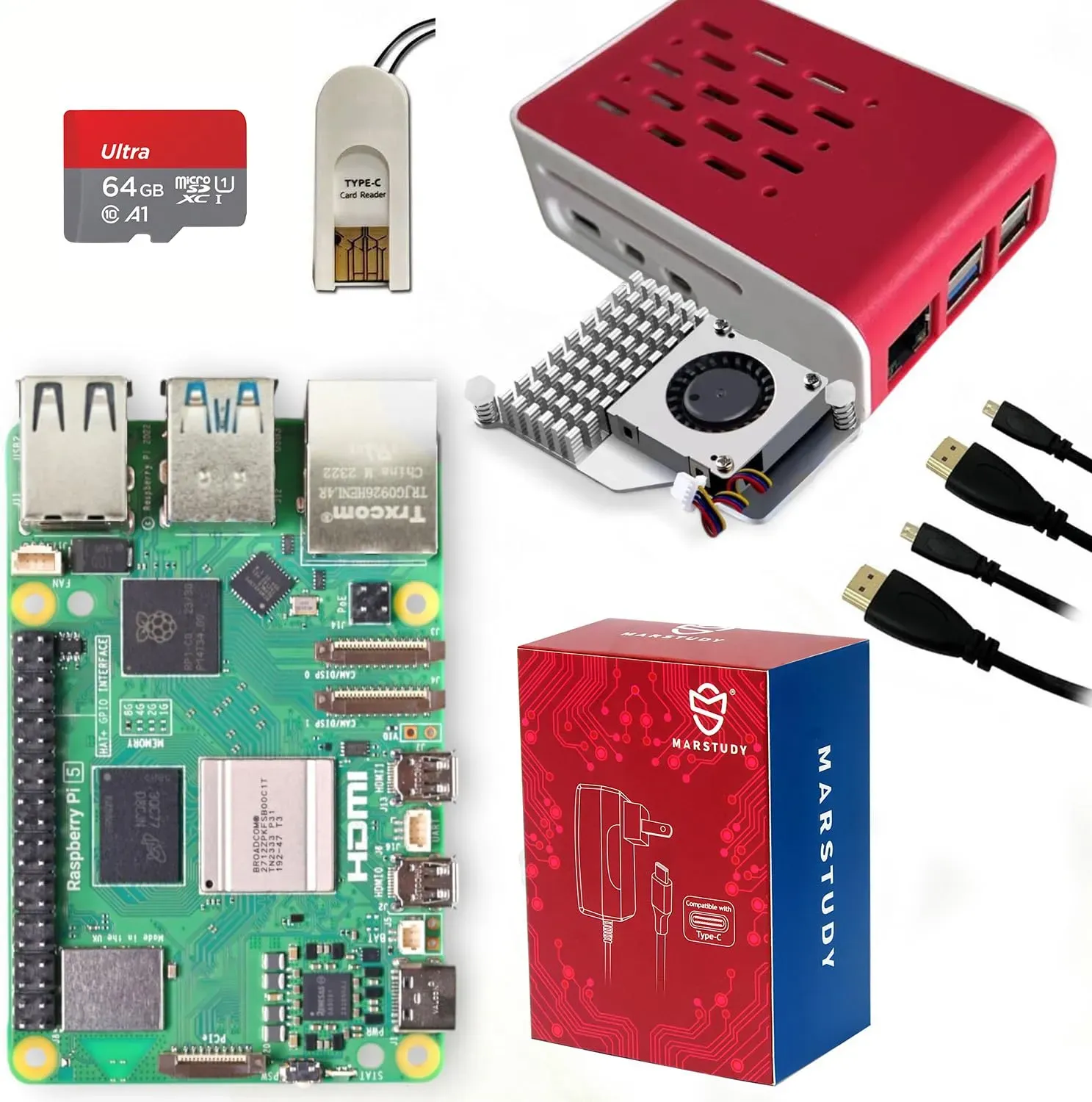 Auf Lager Versand durch AmazonGeeekPi Starter Kit für Raspberry Pi 5 8GB, Inklusive Pi 5 8GB RAM-Board, 64GB SD-Karte und Kartenleser, Pi 5 ABS Gehäuse mit Armor Lite V5 Aktivkühler, 27W 5.1V 5A USB C Netzteil, 2pcs 4K HDMI-Kabel