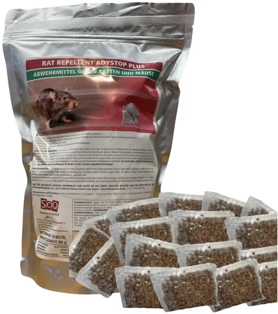 Kategorie: Pflegemittel & Schädlingsbekämpfung - scq soluciones con qu mica - WISSENSCHAFTLICH FUNDIERT: Nachgewiesene Wirksamkeit hält Ratten und Mäuse fern, indem es ihre neuronalen Prozesse beeinflusst und sie von behandelten Bereichen fernhält, auch bei vorhandenen Futterquellen. NATüRLICHE ZUSAMMENSETZUNG: Hergestellt aus einer Kombination spezifischer Extrakte und natürlicher öle. Enthält keine Biozide; mit Bitterstoff, um eine versehentliche Aufnahme durch Kinder oder Haustiere zu vermeiden. EINFACHE ANWENDUNG: Gebrauchsbereite Beutel; 1 Beutel pro 25 m3 platzieren oder alle 3 Laufmeter als Barriere. Ideal zum Schutz von Elektroverteilerschränken/Schaltschränken, Isolierschäumen, Kabelschutzrohren und Verkabelung. WASSERBESTäNDIG: Die spezielle Formel wird nicht durch Regen oder Bodenfeuchte beeinträchtigt. LANG ANHALTENDER SCHUTZ: Wirksamkeit bis zu 2 Monaten, abhängig von den Witterungsbedingungen. Scare-Rat Granulat ist ein natürliches Repellent gegen Ratten und Mäuse, formuliert mit natürlichen Extrakten und ätherischen ölen, die auf neuronaler Ebene wirken. Ideal zum Schutz von Gewächshäusern, Lagern, Kellern, Garagen und mehr. Dank des polymeren Trägermaterials erfolgt eine gleichmäßige, kontinuierliche Freisetzung, die die Wirksamkeit selbst unter widrigen Bedingungen sicherstellt. Biozidprodukte vorsichtig verwenden. Vor Gebrauch stets Etikett und Produktinformationen lesen. Registriernummer nach der Biozid-Meldeverordnung: N-118496. RAT REPELLENT ADYSTOP - ... Die Instalguru Rückstauklappe DN 110 bietet einen zuverlässigen Rattenschutz für größere Abwasserrohre zu einem fairen Preis. ![]() ![]() Instalguru Rückstauklappe dn 110 PVC abwasser rückstauventil rückstauverschluss rückschlagklappe mit Verriegelbarer Rattenschutz für Abwasserrohr Abfluss