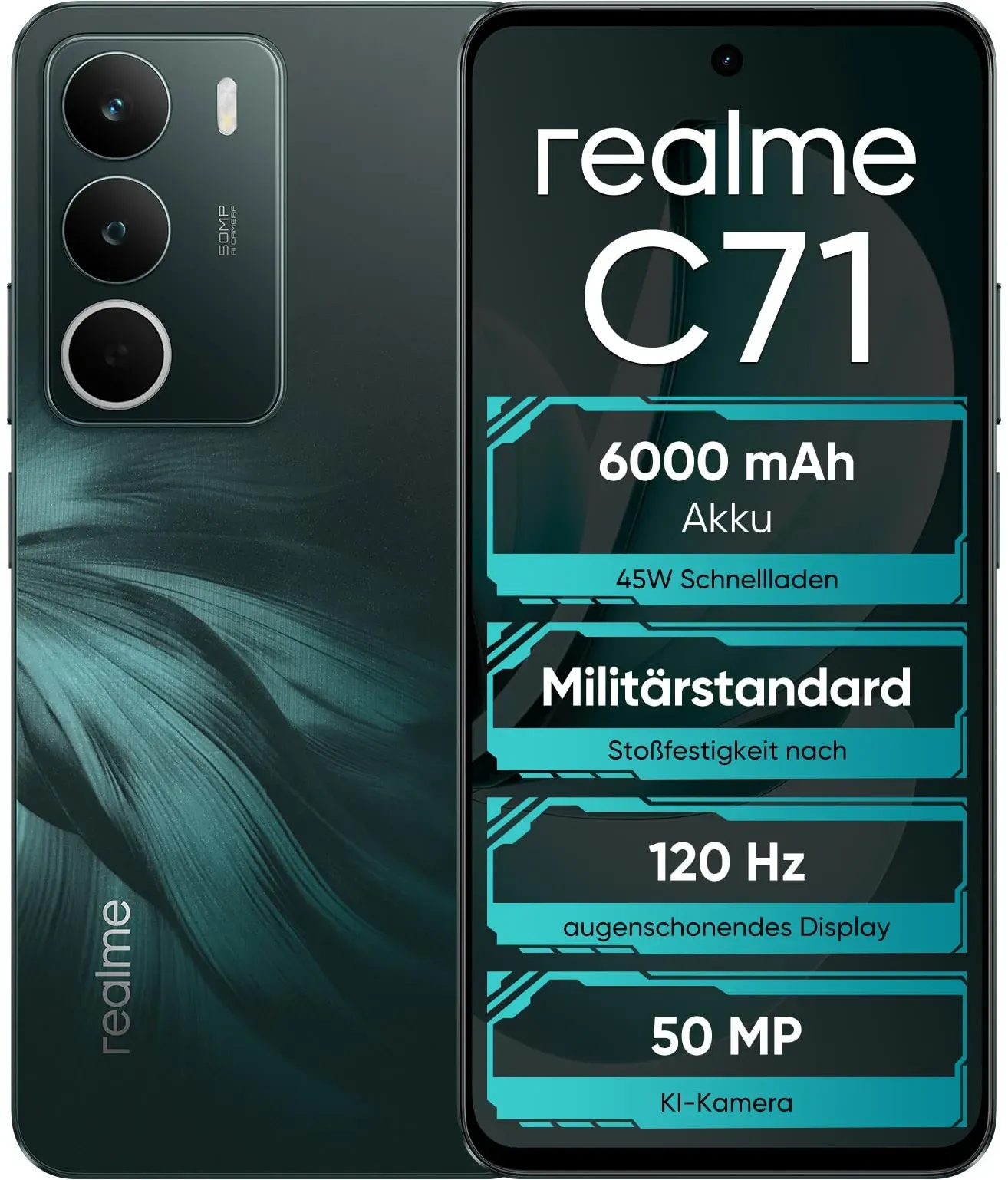Beliebtheit und MarkenRealme ist eine beliebte Marke im Budget-Segment, bekannt für ihre leistungsstarken und preiswerten Smartphones. Das Realme C71 ist besonders für seine lange Akkulaufzeit und Robustheit beliebt. PreisbereichDer Preis für das Realme C71 beginnt bei etwa 119 € und kann je nach Variante und Anbieter bis zu 149 € reichen[1][3]. KaufentscheidungWenn du ein robustes Budget-Smartphone mit langer Akkulaufzeit suchst, könnte das Realme C71 eine gute Wahl sein. Beachte jedoch, dass der Prozessor nicht der neueste ist und die Kamerafunktionen im Vergleich zu höheren Modellen begrenzt sind. Um das Realme C71 direkt zu suchen, kannst du hier klicken: Realme C71. Jetzt live Suche nach realme c71 starten! Empfohlene Realme c71 Angebote*Durch Käufe über Links zu Händlern kann diese Website eine Provision erhalten, u.a. durch das eBay Partner Network und das AmazonPartnerNetDieses Angebot von RealTech EU im amazon.de Marketplace ist mit 109 Euro das absolut günstigste für ein Realme C71 mit 6GB RAM und 128GB Speicher. ![]() ![]()