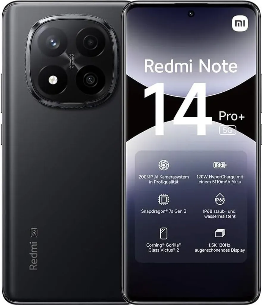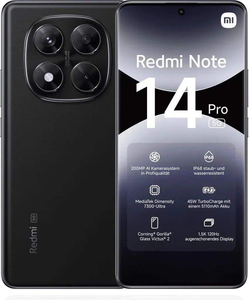Kategorie: Handys ohne Vertrag - Xiaomi - GTIN:6941812721766 - Das Redmi Note 14 Pro 5G vereint fortschrittliche Kamerafunktionen, elegantes Design und modernste Technologie für Nutzer, die eine erstklassige Leistung suchen. Die 200 MP Hauptkamera mit optischer Bildstabilisierung (OIS) liefert beeindruckende Details, ergänzt durch KI-Tools zur Fotoverbesserung und -bearbeitung. Unterstützt wird dieses System von einer 8 MP Ultraweitwinkelkamera, einem 2 MP Makroobjektiv und einer 20 MP Selfie-Kamera. Das 6,67-Zoll gebogene AMOLED-Display bietet eine 1,5K Auflösung, eine Spitzenhelligkeit von 3000 Nits und eine Bildwiederholfrequenz von 120 Hz für lebendige Bilder und flüssige Interaktionen. Angetrieben vom MediaTek Dimensity 7300-Ultra Prozessor mit 4 nm Technologie gewährleistet es nahtloses Multitasking und Gaming. Das Gerät verfügt über IP68 Wasser- und Staubschutz, die Haltbarkeit von Corning Gorilla Glass Victus 2 und ein anspruchsvolles dual-gebogenes Design. Mit einem 5110 mAh Akku und 45 W TurboCharge bietet es langanhaltende Leistung und schnelles Laden, was es zu einer herausragenden Wahl für Innovation und Zuverlässigkeit macht. Hinweis: Ein Ladegerät ist nicht im Paket enthalten. Es wird nur ein USB-C-Kabel zum Laden bereitgestellt. - 285,00 Euro bei Galaxus.de - gefunden von billiger.de Dieses Redmi Note 14 Pro 5G mit 512GB und 12GB RAM für 292 Euro bietet maximale Leistung und Speicherplatz. ![]() ![]() Xiaomi Redmi Note 14 Pro 5G 16,9 cm (6.67") Dual-SIM USB Typ-C 12/512 GB 5110 mAh Schwarz - Schwarz