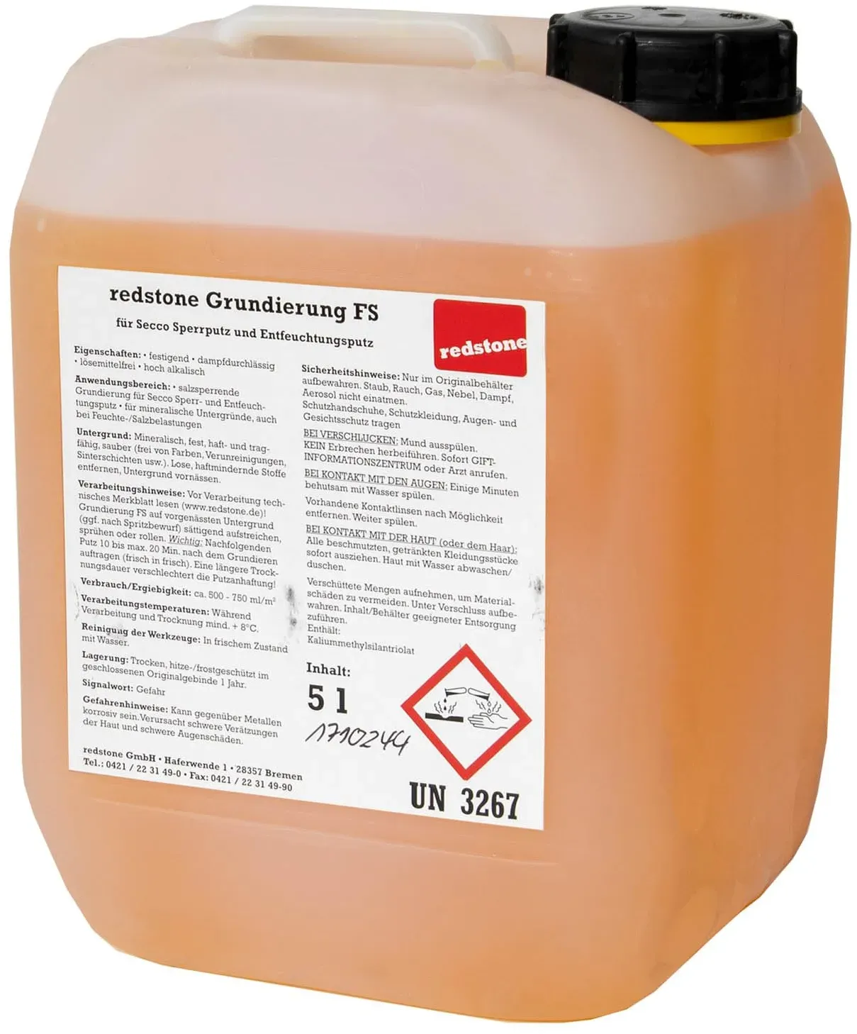 Verfügbarkeit: Auf Lager - Kategorie: Farben & Lacke - Effektive Salzsperre €“ Die Redstone Secco Grundierung FS schützt zuverlässig vor dem Durchschlagen von Salzen aus dem Untergrund und sorgt für eine langlebige Putzschicht. Optimale Untergrundvorbereitung €“ Festigt und stabilisiert mineralische Untergründe für den perfekten Halt von Secco Sperrputz, Sockelputz und Entfeuchtungsputz. Atmungsaktiv & feuchtigkeitsregulierend €“ Die hohe Wasserdampfdurchlässigkeit ermöglicht dem Mauerwerk zu atmen und unterstützt ein gesundes Raumklima. Lösemittelfrei & hoch alkalisch €“ Umweltfreundlich und wirksam gegen Schimmelbildung €“ ideal für nachhaltige Sanierungsprojekte. Einfache Anwendung €“ Nach dem Vornässen des Untergrunds wird die Grundierung gleichmäßig aufgetragen €“ der Putz folgt 'frisch in frisch' für beste Haftung. - 49,90 Euro bei Amazon Marketplace Home Improvement - gefunden von billiger.de ![]() ![]() redstone Grundierung FS Secco 5L ? Salzsperrende & wasserdampfdurchlässige Grundierung ? Vorbehandlung für Secco Sperrputz & Entfeuchtungsputz ? Lösemittelfrei & hoch alkalisch