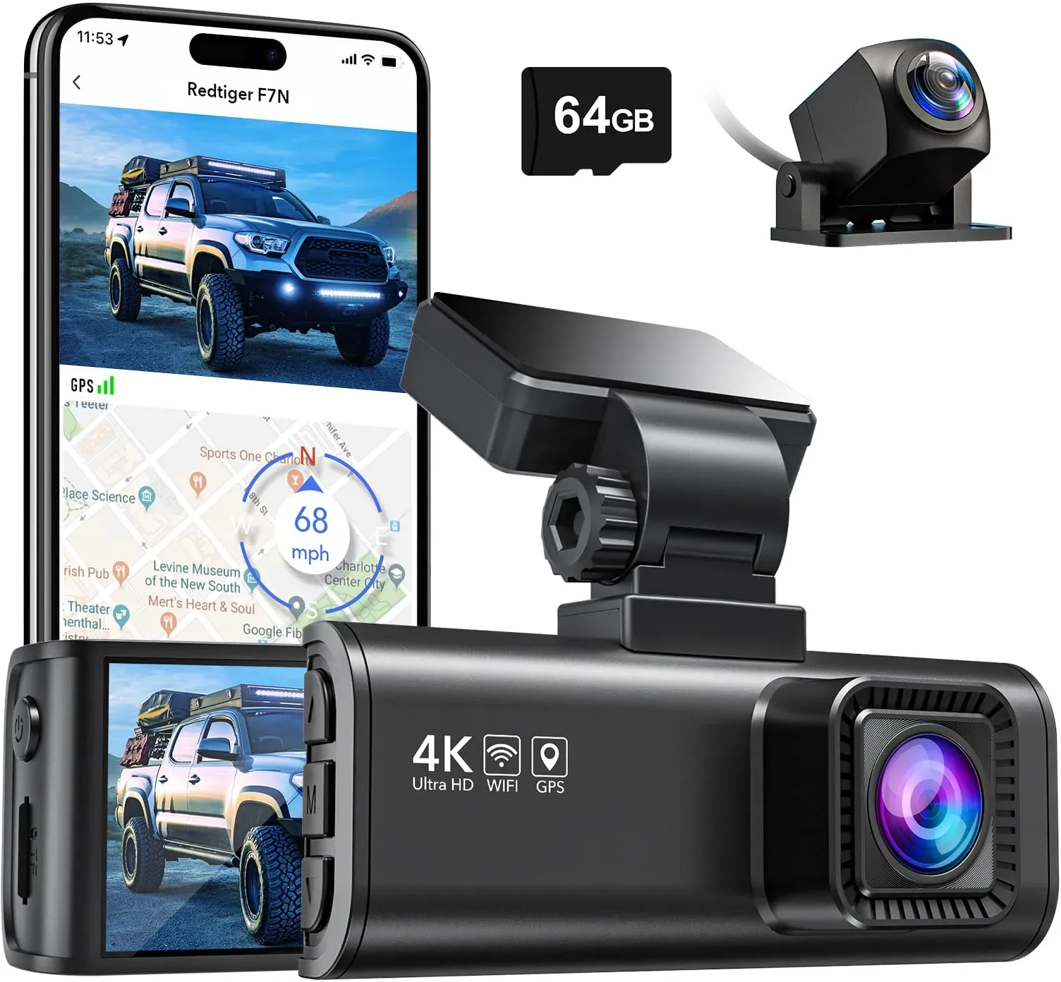 lieferbar-in 5-6 Werktagen bei dirREDTIGER Duale Aufnahme Nachtsicht 170 Weitwinkel Auto Dashcam (Vorne 4K UHD, Hinten 1080p, WLAN (Wi-Fi), GPS,WiFi,24-Stunden-Parkmonitor) schwarz