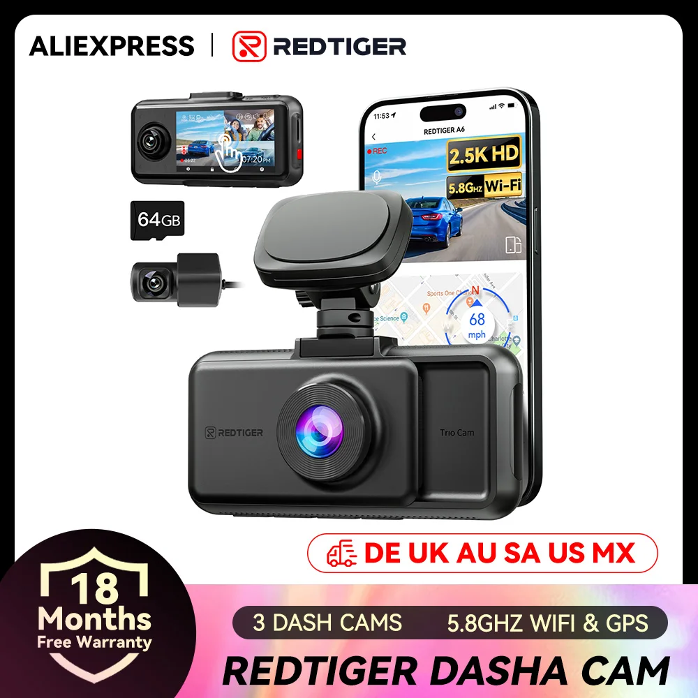 redtiger - REDTIGER A3 3 Kameras vorne/Kabine/hinten Kamera Dashcam Dash Kamera integrierte 5,8 GHz WiFi GPS Auto DVR Nachtsicht Parkmonitor - bei de.aliexpress.com - aus Yadore Produktdaten Die A6 ist eine sehr günstige 3-Kamera-Lösung, die vorne, innen und hinten aufzeichnet, ideal für Taxifahrer oder Fahrdienste. ![]() REDTIGER A6 4K Dashcam, integriert, 5,8 GHz, WiFi, GPS, Auto-DVR, Upgrade, Nachtsicht, Parkmonitor, 3 Kameras vorne/Kabine/hinten