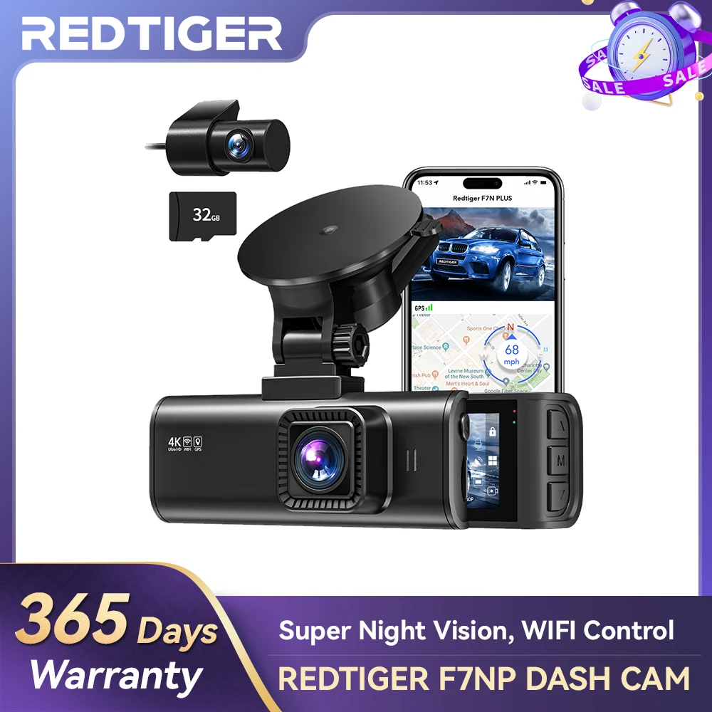 Auf Lager Versand durch AmazonREDTIGER Dashcam Auto vorne hinten 4K/1080P, WiFi GPS Autokamera mit kostenloser 32GB Karte, Schleifenaufzeichnung, Nachtsicht, Parkmodus, intelligente App-Steuerung, Unterstützung bis zu 256GB(F9)