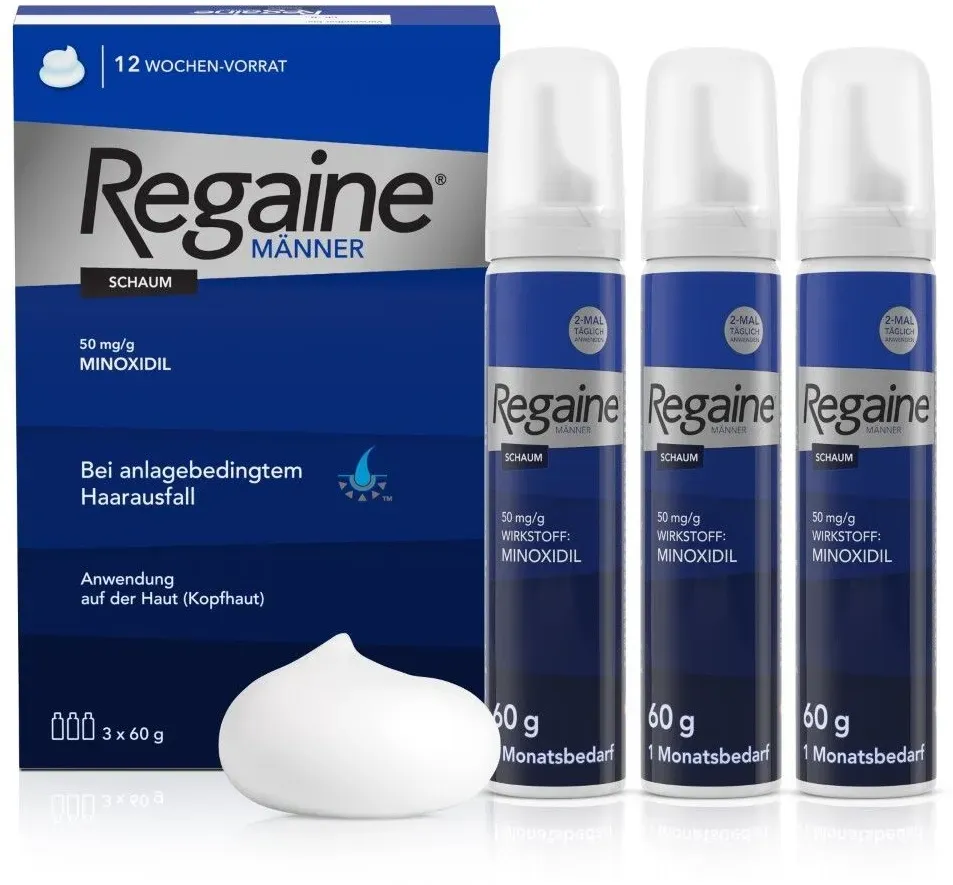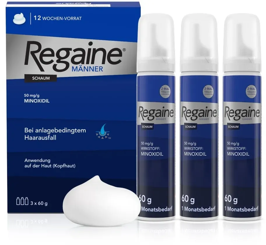 Regaine 3x60 männer schaum META PreisvergleichMit dem Meta-Preisvergleich suchen Sie gleichzeitig bei den großen Preisvergleich Portalen!Jetzt live Suche nach regaine 3x60 männer schaum starten! Regaine 3x60 männer schaum KaufberatungBeim Kauf von Regaine Männer Schaum 3x60 ml sollten Sie vor allem auf die richtige Anwendung, die Inhaltsstoffe und den Preis achten. Regaine Männer Schaum enthält 5% Minoxidil, das zur Behandlung von erblich bedingtem Haarausfall bei Männern eingesetzt wird. Die empfohlene Anwendung ist zweimal täglich (morgens und abends) auf die trockene Kopfhaut, jeweils etwa 1 g Schaum (entspricht einer halben Verschlusskappe), der sanft einmassiert wird[1][3][5]. Wichtige Hinweise zur Anwendung: