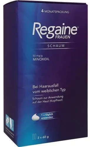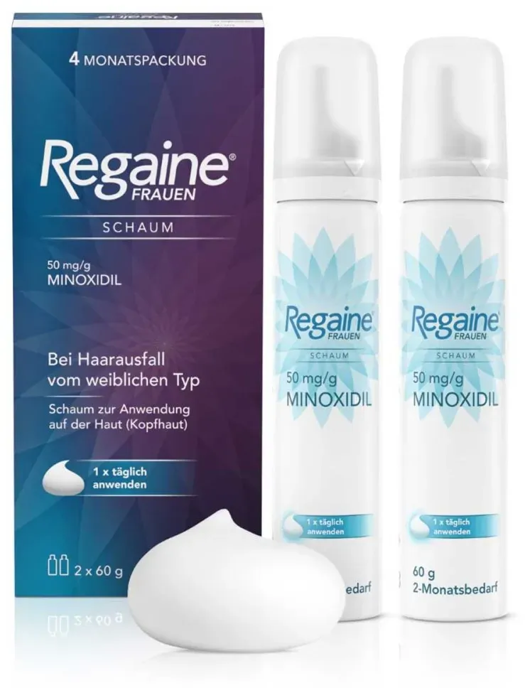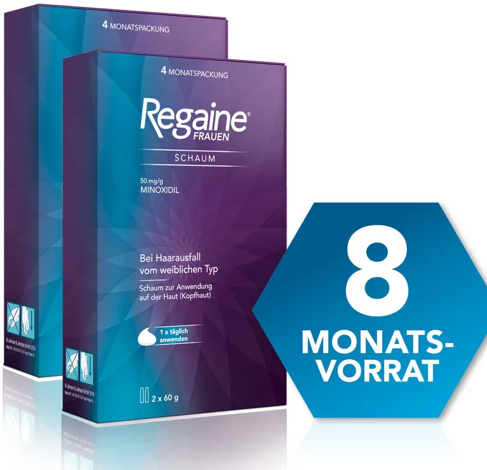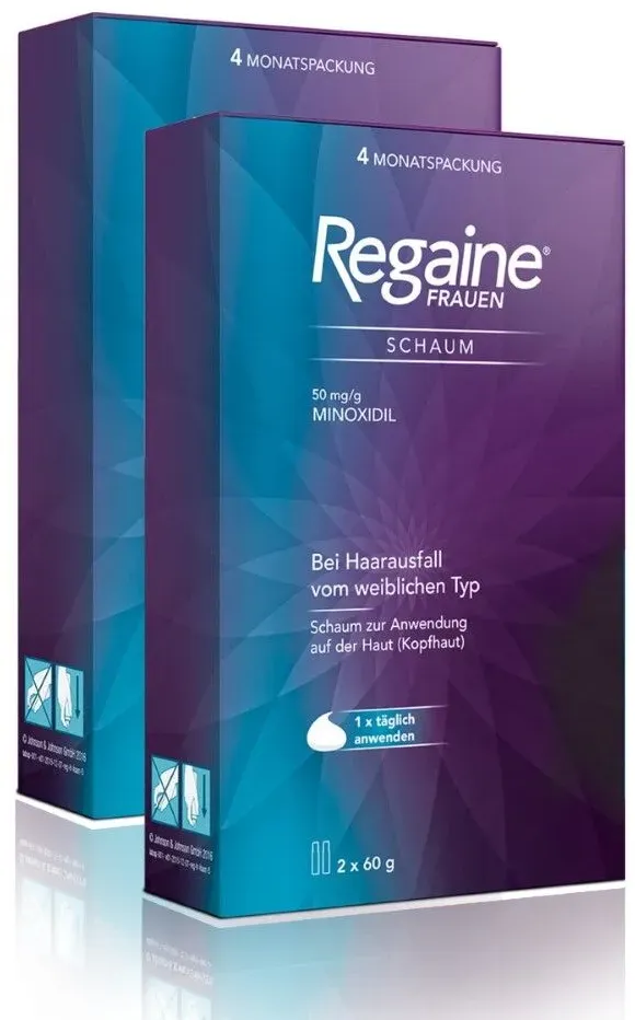 Verfügbarkeit: 1-3 Werktage - Kategorie: Arzneimittel - kenvue - GTIN:3574661202839 - PZN:11082202 - Anwendungsgebiet von Regaine Frauen Schaum Regaine Frauen Schaum stabilisiert bei Frauen den Verlauf der androgenetischen Alopezie vom weiblichen Typ (charakteristische anlagebedingte diffuse Kopfhaarverdünnung im Scheitelbereich). Die Behandlung mit Regaine Frauen Schaum fördert das Haarwachstum und kann so dem Fortschreiten dieses Haarverlustes entgegenwirken.Wirkungsweise von Regaine Frauen Schaum Viele Frauen mit Haarausfall wünschen sich das Haarwachstum zu beschleunigen Zur Behandlung von Haarausfall gibt es viele Haarwuchsmittel für Frauen auf dem Markt. Regaine hat speziell gegen Haarausfall bei Frauen ein Produkt entwickelt - Regaine Frauen Schaum . Das Besondere an Regaine ist, dass es auf den Wirkstoff Minoxidil setzt. Denn Minoxidil hat sich bei erblich bedingtem Haarausfall bei Frauen bewährt, da dieser das Haarwachstum fördert. Die Haarfollikel werden besser durchblutet und können somit besser mit Nährstoffen versorgt werden. Die Haarwurzeln können gestärkt werden und das Haar über einen längeren Zeitraum wachsen. Dadurch können sich die Zellen länger aktiv teilen und verstärkt erneuern. Wird die Behandlung wie empfohlen durchgeführt, ist ein erster Therapieerfolg bereits nach 12 Wochen möglich. Wirkstoffe / Inhaltsstoffe / Zutaten1 g Schaum Regaine Frauen Schaum enthält: 50 mg Minoxidil Sonst. Bestandt.: Ethanol, Butylhydroxytoluol (E321), ... Diese 8-Monats-Vorratspackung ist ideal für langfristige Anwenderinnen und bietet eine deutliche Ersparnis pro Einheit. ![]() ![]() Johnson & Johnson REGAINE Frauen Schaum mit Minoxidil: Stoppt erblich bedingten Haarausfall bei Frauen und regt das Haarwachstum an, 8-Monats-Vorrat, 2 x 2 x 60 g