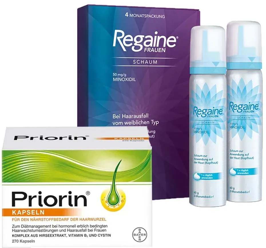 Verfügbarkeit: 1-2 Werktage - 415,46 €/kg - Kategorie: Pflaster - Johnson & Johnson - GTIN:4150081060977 - Regaine® FRAUEN SCHAUM €“ bei hormonell-erblich bedingtem Haarausfall Hormonell-erblich bedingter Haarausfall? Sie sind nicht allein: Bis zu 42 % der Frauen leiden darunter. Eine Lösung stellt Regaine® FRAUEN SCHAUM dar, der mit seinem Wirkstoff Minoxidil in einzigartiger 5 %iger Konzentration direkt an der Wurzel des Problems wirkt: Auf die Kopfhaut aufgetragen, kann Minoxidil den Haarausfall stoppen und das Wachstum neuer, kräftigerer Haare fördern €“ ohne in den Hormonhaushalt einzugreifen! Die Wirkweise von Regaine® FRAUEN SCHAUM Der in Regaine® FRAUEN SCHAUM enthaltene Wirkstoff Minoxidil, welcher von Regaine® erstmals in 5 %iger Konzentration (50 mg/g) für Frauen angeboten wird, kann hormonell-erblich bedingten Haarausfall stoppen. Der Wirkstoff erweitert u.a die Blutgefäße und regt so die Blut- und Nährstoffversorgung der Haare an: Mehrere wissenschaftliche Studien konnten zeigen, dass schon nach 12 Wochen der hormonell-erblich bedingte Haarausfall gestoppt und neuer Haarwuchs gefördert werden konnte. Wie wird Regaine® FRAUEN SCHAUM angewendet? Tragen Sie 1 x täglich 1 g €“ entspricht in etwa einer halben Schutzkappe €“ Regaine® FRAUEN SCHAUM auf. Vor der Anwendung von Regaine® FRAUEN SCHAUM sind diese Punkte zu beachten: Kopfhaut und Haare müssen trocken sein. Stellen Sie eine kalte Oberfläche, wie bspw. einen Unterteller, zum ... Dieses Set mit Priorin Kapseln und Regaine Schaum ist eine umfassende Lösung für Frauen, die eine kombinierte Behandlung wünschen. ![]() ![]() Priorin Kapseln + Regaine Frauen Schaum 4 Monats-Vorrat 1 St Set