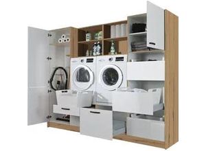 Wohnen - - Produktdetails: Set beinhaltet: Schrank-Set Arta, Serie: Arta, Art Griffe: Bügelgriff, Farbe Material: Material Korpus: Holzwerkstoff, Oberflächenbehandlung Korpus: melaminbeschichtet, Optik Korpus: Holzsturktur, Material Türen: Holzwerkstoff, Material Beschläge: Scharniere und Laufleisten aus Metall, Oberflächenbehandlung Türen: melaminbeschichtet, Material Einlegeböden: Holzwerkstoff, Material Schubladen: Holzwerkstoff, Oberflächenbehandlung Schubladen: melaminbeschichtet, Material Griffe: Metall, Oberflächenbehandlung Griffe: matt, Material Füße: Kunststoff, Materialhinweis: Korpus und Front: Holzwerkstoff, melaminbeschichtet, Griffe, Scharniere und Laufleisten aus Metall, Füße aus Kunststoff, Farbbezeichnung: weiß/ eichefarben astig, Material: Holzwerkstoff, Oberflächenbeschichtung: melaminharzbeschichtet, Optik: matt, Farbe Einlegeböden: weiß, Farbe Füße: schwarz, Farbe Griffe: schwarz matt, Farbe Korpus: eiche astig, Farbe Schubladen: weiß, Farbe Türen: weiß, Schrank: Art Schrank: Mehrzweckschrank, Anzahl Schrank: 6 Stk., Tiefe Schrank: 58 cm, Höhe Schrank: 207 cm, Gewicht Schrank: 52 kg, Ausstattung Schrank: 3 Schubkästen mit Frontblende grifflos, inkl. 3 weißer Wäschekörbe, Fassungsvermögen Wäschekörbe: ca. 41l, 1 fester Boden, 1 Tür, 1 verstellbarer Einlegeboden, Anzahl Türen Schrank: 1 Stk., Art Türen Schrank: Drehtür, Belastbarkeit Einlegeböden Schrank: 15 kg, Anzahl Schubladen Schrank: 3 Stk., Art Schrank 2: Waschmaschinenumbauschrank, Anzahl Schrank ... ![]() ![]() Schrank-Set EXPRESS KüCHEN 'Arta', weiß, eichefarben astig, B:240cm, Holzwerkstoff, Kastenmöbel-Sets, Mehrzweckschrank, ohne Geräte, vormontiert, mit Soft-Close-Funktion, Stellbreite 245cm