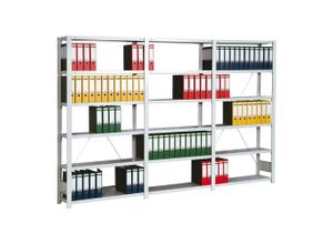 Arbeiten Wohnen - - Hinweis: Es handelt sich bei diesem Produkt um ein Anbauregal, welches an ein bestehendes Grundregal angebaut werden kann. Ohne das Grundregal ist das produkt nicht nutzbar! Universalregale für Archiv und Büro Büroregale mit Stahlfachböden, RAL 7035 lichtgrau Büroregale, verzinkt Das Universalregal eignet sich in idealer Weise für den Einsatz als Archivregal und als Büroregal. Die Systemmaße und die Feldbreiten erlauben eine optimale Einlagerung von Standard-Ordnern ohne Platzverluste. Mit der Regaltiefe von 600 mm ist eine doppelseitige Nutzung möglich. Durch Grund- und Anbaufelder lässt sich das Regal zu jedem gewünschten Maß (Regallänge) kombinieren. Unterschiedliches Systemzubehör wie Fachteiler, Mittelanschläge oder Rückanschläge erhöht die Funktionalität der Regale in Büro und Archiv. Archivregal ∙ Fachebene Paneel ∙ Höhenverstellbar im Rastermaß 25 mm ∙ Regalhöhe 2.075 mm für 5 Ordnerhöhen ∙ Regalhöhe 2.500 mm für 6 Ordnerhöhen ∙ Feldbreiten: 875/1.005/1.285/1.695 mm ∙ Keine zusätzliche Aussteifung erforderlich Büroregal ∙ Fachebene Stahlboden, 40 mm Rohrkante ∙ Höhenverstellbar im Rastermaß 25 mm ∙ Regalhöhe 2.000 mm für 5 Ordnerhöhen ∙ Regalhöhe 2.325 mm für 6 Ordnerhöhen ∙ Feldbreiten: 875, 1.005 und 1.285 mm ∙ Aussteifungen - bei Regaltiefe 300 mm mit Kreuzdiagonalen - bei Regaltiefe 600 mm mit Längenriegel für beidseitige Regalnutzung Rahmen wahlweise: Mit Tiefenriegel oder mit Seitenwänden (Vollblech verzinkt) Rahmen ... Ein hochwertiges Regal im Industrial Design aus Massivholz und Metall, das eine langlebige und stilvolle Aufbewahrungsmöglichkeit bietet. ![]() Regal GUTMANN FACTORY 'Porto', schwarz (schwarz, natur), B:50cm H:180cm T:30cm, Massivholz, Metall, Regale, Regal, im Industrial Design
