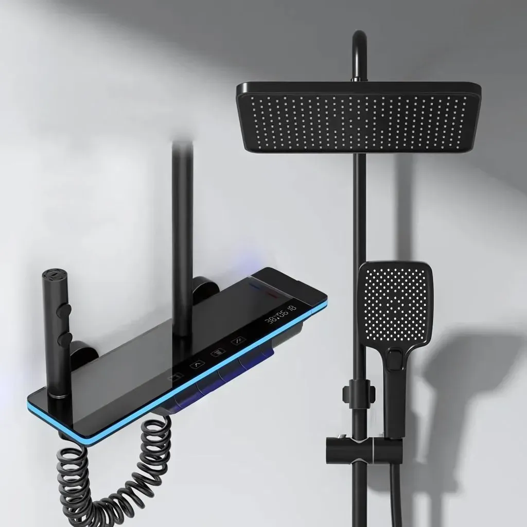 Kategorie: Brausegarnituren - hs.supply - GTIN:9508118353250 - Erleben Sie Duschen in einer neuen Dimension! Unsere innovative digitale Duscharmatur kombiniert modernste Technologie mit einem eleganten Design, um Ihr Badezimmer in eine Wellness-Oase zu verwandeln. Produktmerkmale im überblick Intuitives Bedienfeld: Präzise Steuerung von Wassertemperatur, Druck und Funktionen alles über eine benutzerfreundliche Oberfläche mit integriertem Display. LED-Design: Hochglänzende Oberfläche mit sanfter LED-Beleuchtung, die jedes moderne Badezimmer aufwertet. Regenduschkopf: Sanfte und gleichmäßige Wasserverteilung für ein entspanntes Spa-Feeling zu Hause. Wasserfallauslass: Integrierter Wasserfall für ein s Duscherlebnis. Handbrause mit Strahlmodi: Anpassbare Strahlarten für individuelle Bedürfnisse von sanft bis intensiv. Turbo-Brause: Starker Wasserstrahl ideal für Massagen oder die schnelle Reinigung Ihrer Dusche. Nachhaltig & effizient: Spart Wasser und Energie, ohne den Komfort zu beeinträchtigen. Einfache Installation: Schnell montierbar und kompatibel mit gängigen Wasseranschlüssen.Warum diese digitale Dusche?Diese Duscharmatur vereint Funktionalität, Komfort und modernes Design: Perfekte Kontrolle: Dank des intuitiven Bedienfelds stellen Sie Wassertemperatur und Druck nach Ihren Vorlieben ein. LED-Beleuchtung: Schafft eine stimmungsvolle Atmosphäre und funktioniert ausschließlich durch Wasserkraft keine externe Stromquelle erforderlich.Technische Daten auf einen ... Ein Duschsystem von Schöner Wohnen-Kollektion mit Thermostat und Regendusche in Chrom, das ein komplettes und stilvolles Set darstellt. ![]() Manomano.d e