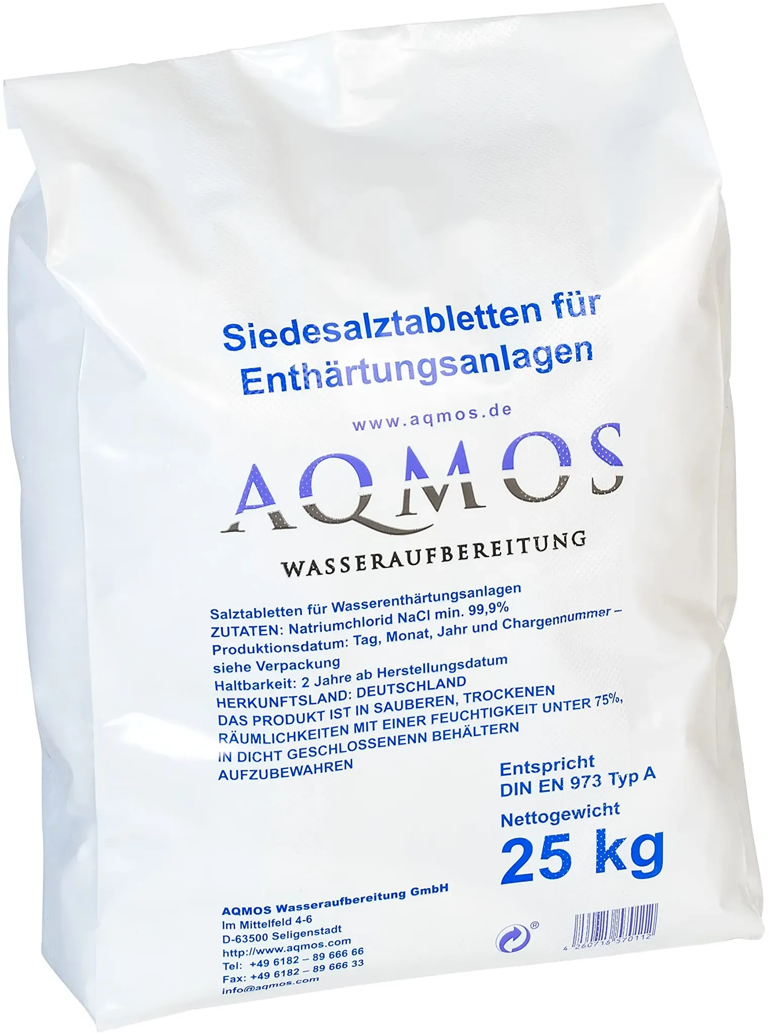 Zustand: Neu - Regular Stores - AQMOS Wasseraufbereitung Aqmos Wasseraufbereitung - AQRS-500 - EAN: 0714637222246 - Das hochreine Siedesalz erfüllt die Anforderungen nach DIN EN 973 Typ A (ehemals DIN 19604) Das hochreine Siedesalz erfüllt die Anforderungen nach DIN EN 973 Typ A (ehemals DIN 19604) Es ist bei trockener Lagerung zerfallsbeständig und unbegrenzt haltbar. Regeneriersalztabletten sind für den Einsatz von Wasserenthärtungsanlagen optimal geeignet Sie lösen sich rückstandsfrei auf und bilden somit die Natriumchlorid-Lösung, welche für die Regeneration des Ionenaustauscher-Harzes in Wasserenthärtungsanlagen von hoher Bedeutung ist Das Salz in Tablettenform ist optimal zur Erzeugung solcher Salzlösungen geeignet. Technische Daten: Natriumchlorid mindestens 99,90 % Technische Daten: Calcium nicht mehr als 0,09 %, Magnesium nicht mehr als 0,03 %, Eisen nicht mehr als 0,007 %, Sulfate nicht mehr als 0,04 %, unlösliche Bestandteile nicht mehr als 3,0 mg/kg, Feuchte - Verkäufer: AQMOS Wasseraufbereitung im amazon.de Marketplace ![]() ![]() Regeneriersalztabletten 20 - x 25KG eBay (500KG) Spezialsalztabletten