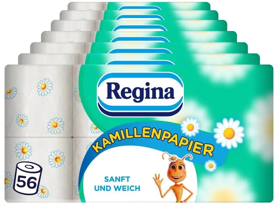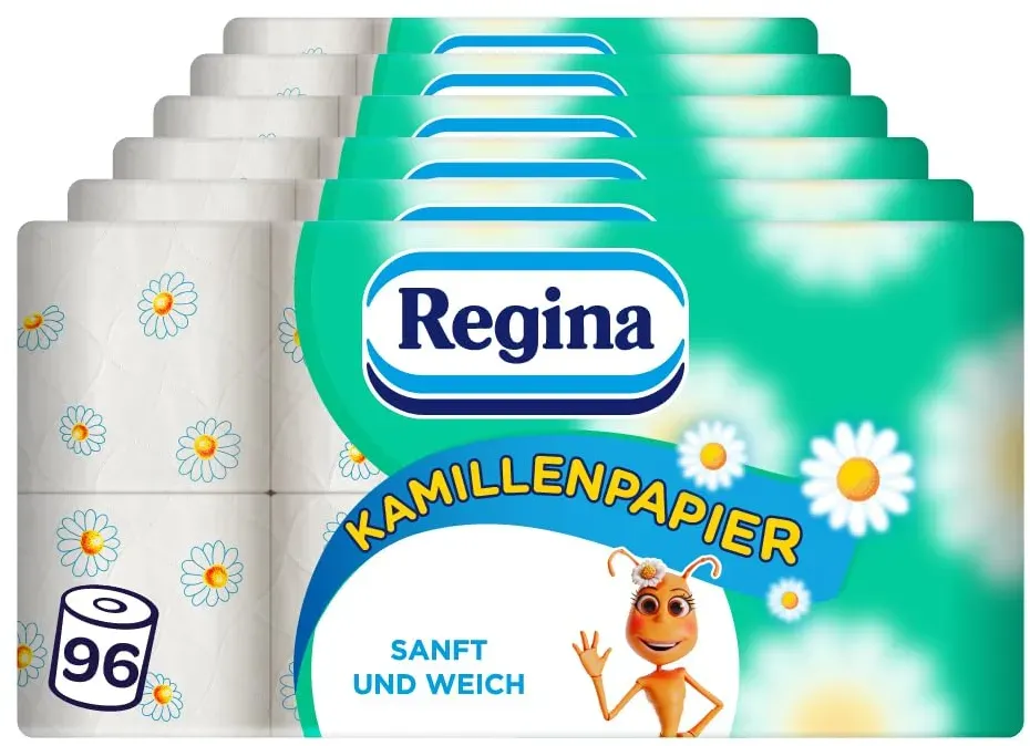 Verfügbarkeit: Auf Lager - 0.35 / 100 Blätter - Kategorie: Hygieneartikel - Regina - GTIN:8004260007740 - Regina Kamillenpapier ist ein sanftes und zuverlässiges Toilettenpapier, das dezent nach Kamille duftet, womit es seit Jahren die Herzen aller Käufer erobert Unser Toilettenpapier-Multipack enthält 96 Rollen mit jeweils 150 Blatt, 3-lagiges Toilettenpapier für empfindliche Haut, das ein entzückendes Kamillen-Muster aufweist und angenehme Hygiene für die ganze Familie rt Mit dem FSC-zertifizierten Regina Toilettenpapier schützen Sie die Umwelt, da es aus Rohstoffen hergestellt wird, die in nachhaltig bewirtschafteten Wäldern und kontrollierten Quellen gewonnen wurden Das Maskottchen Milla und ihre Freunde erleben täglich Abenteuer und steht sich für eine Welt voll Harmonie, Achtung für unsere Mitmenschen und die Natur und natürlich Spaß €“ entdecke Millas Welt Regina Kamillenpapier ist ein Produkt der Sofidel-Gruppe, einer der weltweiten Marktführer im Hygienepapier-Bereich - 49,99 Euro bei Amazon Marketplace Health & Personal Care - gefunden von billiger.de Dieses umfangreiche Angebot mit 112 Rollen ist perfekt für sehr große Haushalte oder Unternehmen, die einen maximalen Vorrat wünschen. Schaefer- shop.de Toilettenpapier Regina Kamillenpapier, 3-lagig, Kamillenduft, weich & saugstark, FSC R -Papier, weiß mit Blumenprint, 112 Rollen mit jeweils 150 Blatt