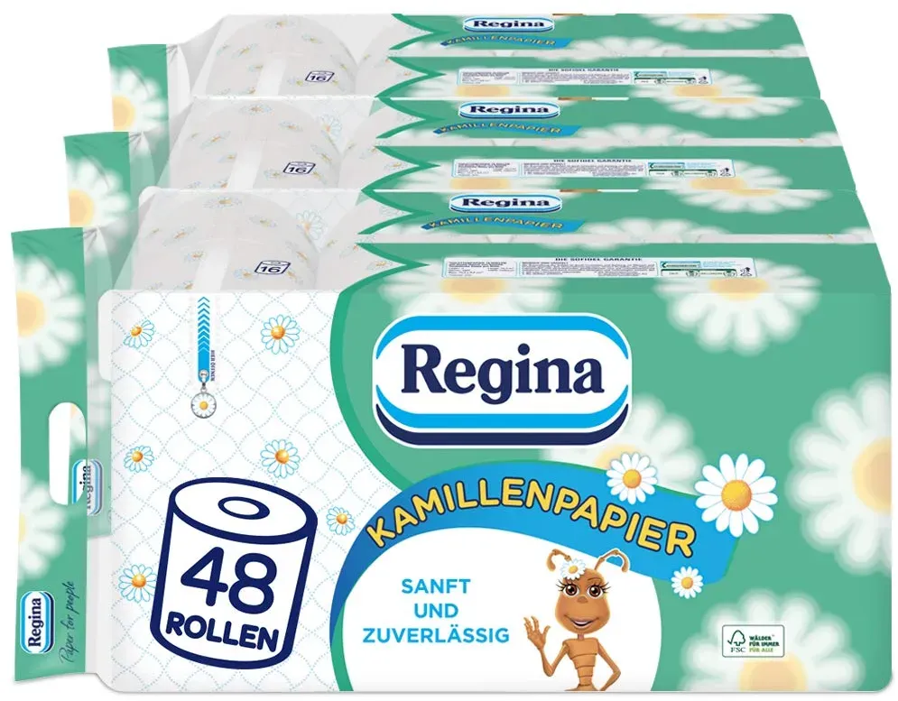 Auf Lager Versand durch AmazonRegina Kamillenpapier 3-lagiges Toilettenpapier, 48 Rollen-Packung (3 x 16 Einzelpackungen), 150 Blatt pro Rolle, Sanft und zuverlässig, Mit einem Hauch von Kamille, FSC-zertifiziertes Papier