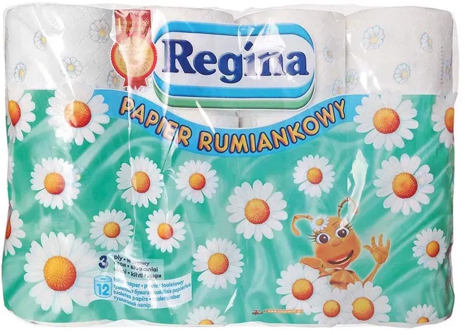 Zustand: Neu - 0,29 € / 100 Blätter - Toilettenpapiere - Regina - 8004260458702 - EAN: 8004260458702 - Regina Kamillenpapier ist ein sanftes und zuverlässiges Toilettenpapier, das dezent nach Kamille duftet, womit es seit Jahren die Herzen aller Käufer erobert Unser Toilettenpapier-Multipack enthält 16 Rollen mit jeweils 150 Blatt, 3-lagiges Toilettenpapier für empfindliche Haut, das ein entzückendes Kamillen-Muster aufweist und angenehme Hygiene für die ganze Familie rt Mit dem FSC-zertifizierten Regina Toilettenpapier schützen Sie die Umwelt, da es aus Rohstoffen hergestellt wird, die in nachhaltig bewirtschafteten Wäldern und kontrollierten Quellen gewonnen wurden Das Maskottchen Milla und ihre Freunde erleben täglich Abenteuer und steht sich für eine Welt voll Harmonie, Achtung für unsere Mitmenschen und die Natur und natürlich Spaß - entdecke Millas Welt Regina Kamillenpapier Toilettenpapier ist ein Produkt der Sofidel-Gruppe, einer der weltweiten Marktführer im Hygienepapier-Bereich - bei Amazon.de Dieses Angebot für 12 Rollen ist preislich attraktiv und bietet eine gute Menge für den regelmäßigen Gebrauch. ![]() ![]() Regina Regina-Pap12R_Rum Kamillen-Toilettenpapier