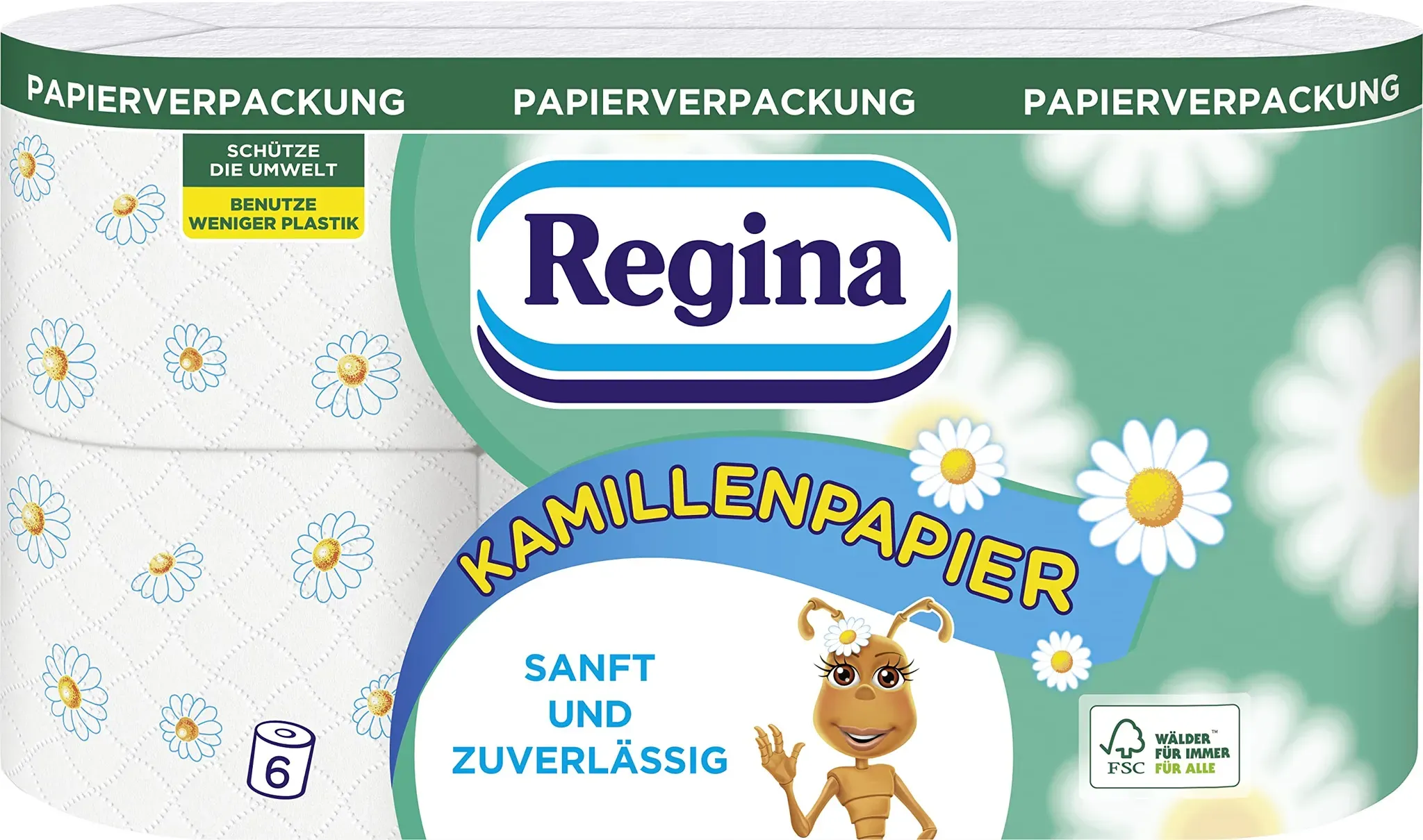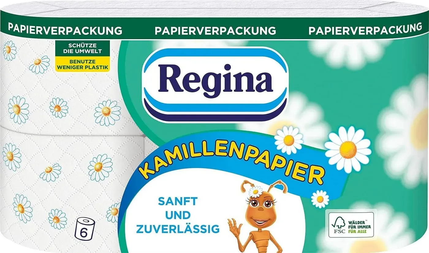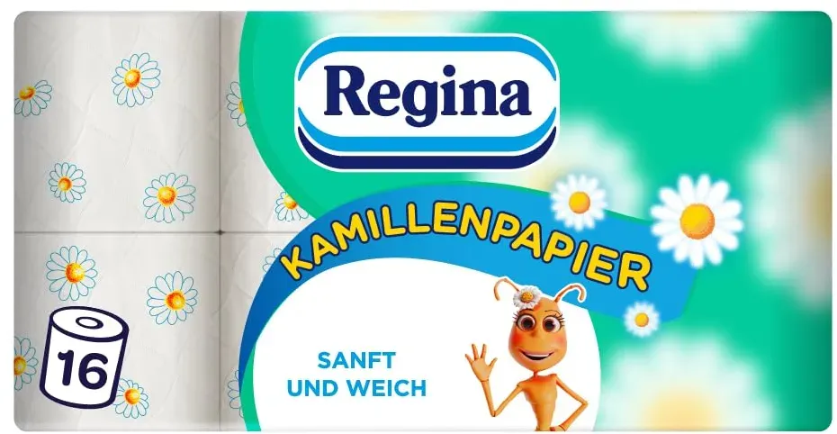 8 Händlerangebote bei billiger.de - Kategorie: Hygieneartikel - Regina - Regina Kamillenpapier ist ein sanftes und zuverlässiges Toilettenpapier, das dezent nach Kamille duftet, womit es seit Jahren die Herzen aller Käufer erobert Unser Toilettenpapier-Multipack enthält 16 Rollen mit jeweils 150 Blatt, 3-lagiges Toilettenpapier für empfindliche Haut, das ein entzückendes Kamillen-Muster aufweist und angenehme Hygiene für die ganze Familie rt Mit dem FSC-zertifizierten Regina Toilettenpapier schützen Sie die Umwelt, da es aus Rohstoffen hergestellt wird, die in nachhaltig bewirtschafteten Wäldern und kontrollierten Quellen gewonnen wurden Das Maskottchen Milla und ihre Freunde erleben täglich Abenteuer und steht sich für eine Welt voll Harmonie, Achtung für unsere Mitmenschen und die Natur und natürlich Spaß €“ entdecke Millas Welt Regina Kamillenpapier Toilettenpapier ist ein Produkt der Sofidel-Gruppe, einer der weltweiten Marktführer im Hygienepapier-Bereich - GTIN:8004260458702 Ein solides Angebot für 16 Rollen zu einem fairen Preis, ideal für Familien. ![]() ![]()