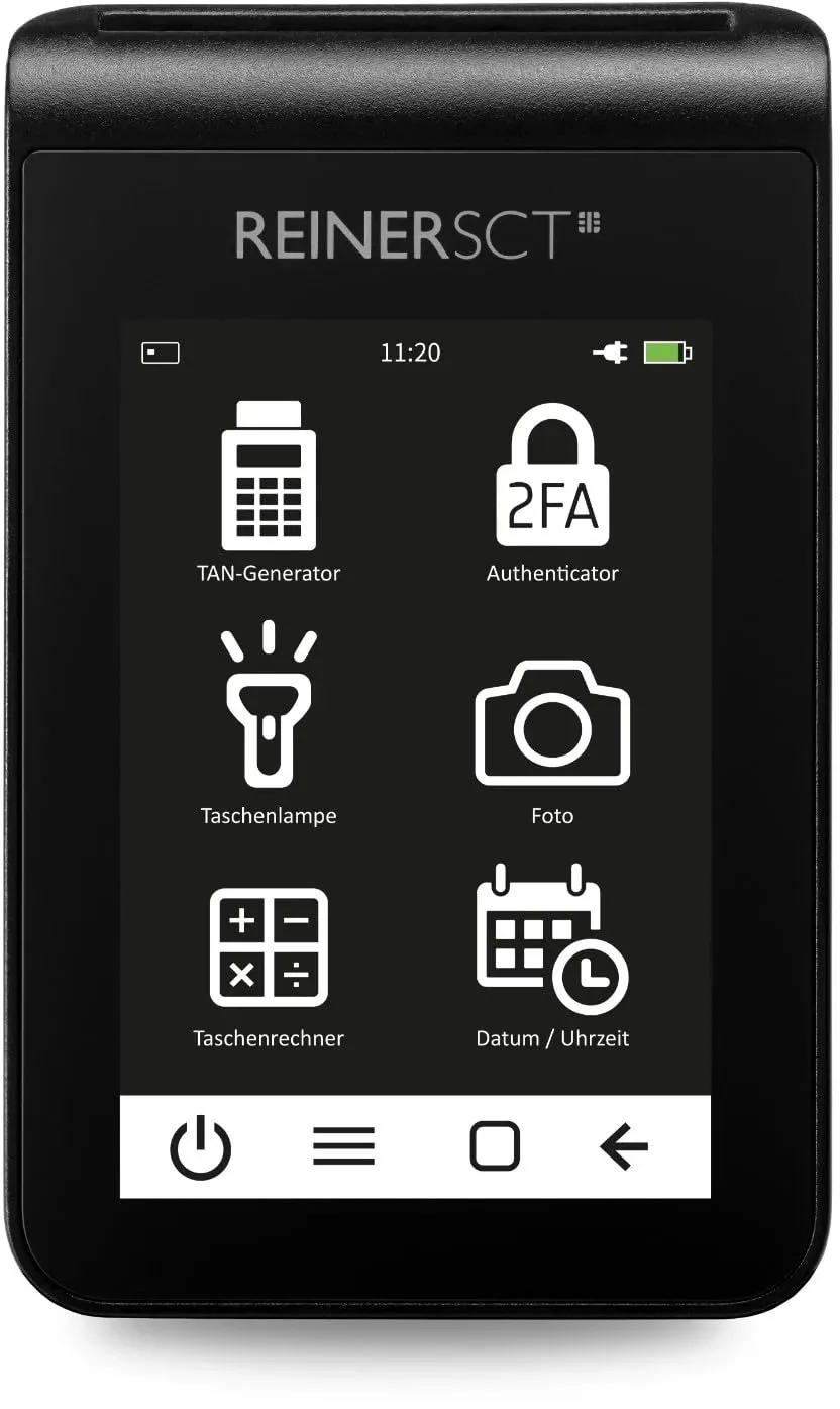 keine Angabe sofort lieferbar (ca. 3 Werktage) in_stockTAN & TOTP Generator REINER SCT tanJack R deluxe, 2-Faktor-Authentisierung, zusätzlicher PIN-Schutz 3,5€³ Touchdisplay, Kartenslot, inkl. Ladestation & Netzteil, schwarz