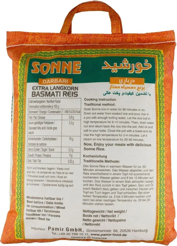 6 Händlerangebote bei billiger.de - Kategorie: Reis & Hülsenfrüchte - Pamir - Sonne Darbari 5Kg Lieferung erfolgt entweder in Jute oder Plastik-VerpackungBasmati Reis Sonne Darbari ist ein qualitativ hochwertiger, duftender Reis, der in Indien hergestellt wird.Die 5 kg Packung eignet sich perfekt für Familien, die regelmäßig größere Mengen an Reis benötigen.Der Basmati Reis ist bekannt für seine lange, schlanke Kornform und seinen charakteristischen Duft.Er ist reich an Nährstoffen und Ballaststoffen und eignet sich daher hervorragend als Beilage zu vielen Gerichten.Dieser Basmati Reis ist sowohl für die Zubereitung in einem Reiskocher als auch für die Herstellung von Reiskruste geeignet.Der Reis behält auch nach dem Kochen eine weiche Konsistenz und ist daher eine ausgezeichnete Wahl für verschiedene Reisgerichte. Insgesamt ist der Basmati Reis Sonne Darbari eine gute Wahl für Menschen, die auf der Suche nach einem hochwertigen,duftenden Reis aus Indien sind, der sich für die Zubereitung in einem Reiskocher oder die Herstellung von Reiskruste eignet.Zubereitungshinweise:Einweichen: Den Reis 1€“2 Stunden in leicht gesalzenem Wasser einweichen. Dadurch entfalten sich die Körner optimal in ihrer Länge.Kochen: Den Reis anschließend in frischem Wasser zubereiten. Auf 1 Tasse Reis etwa 2 Tassen Wasser verwenden. Zum Kochen bringen, dann die Hitze reduzieren und bei geschlossenem Deckel köcheln lassen, bis das Wasser vollständig aufgenommen ist. Der Reis ... Dieser Basmati Reis in der 5 kg Packung bietet eine gute Menge für einen fairen Preis. ![]() ![]() Pamir Khorshid Sonne Basmati Reis Darbari Extra Langkorn Reis 5 Kg