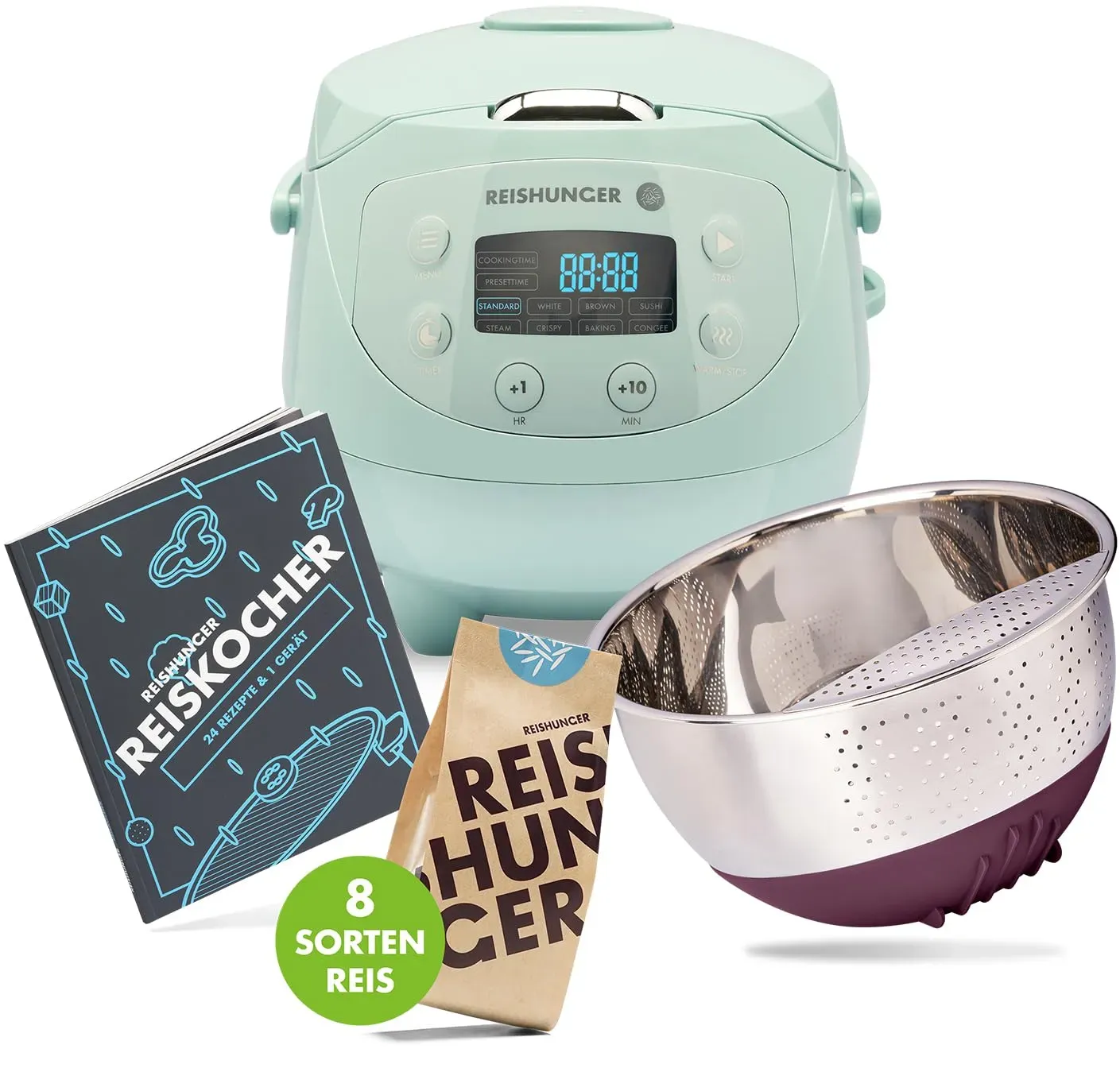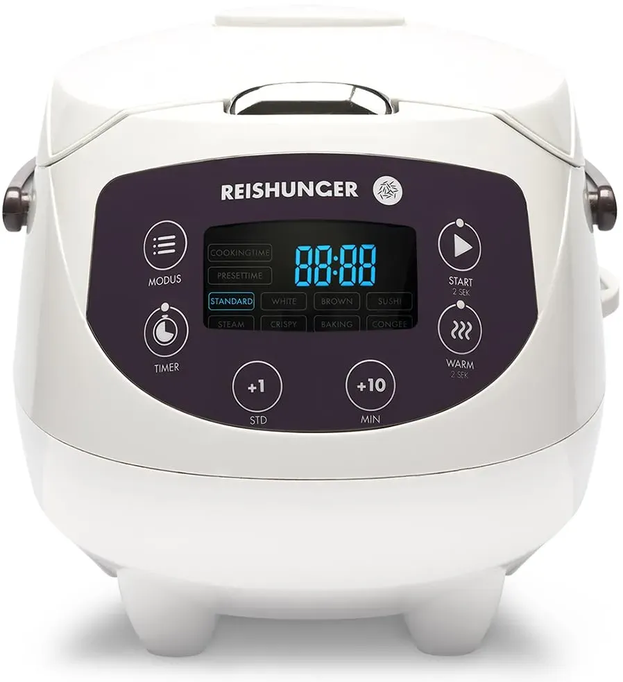Kategorie: Reiskocher - Reishunger - GTIN:4260541686132 - MULTIKOCHER MIT 12 KOCHMODI Entdecke 12 vielfältige Programme für den vollen Genuss: Reis, Weißer Reis, Vollkorn Reis, Sushi Reis, Crispy, Congee, Turbo, Quinoa, Getreide, Suppe, Dämpfen und Backfunktion. INTELLIGENTE FUZZY LOGIC Anstatt auf voller Stufe gart die bahnbrechende Fuzzy Logic deinen Reis nährstoffschonend wie ein Dampfgarer und sorgt gleichzeitig dafür, dass du immer volles Reisaroma und die perfekte Konsistenz erhältst. KOMFORTABLE NUTZUNG Die Bedienung ist dank intuitivem digitalen Display kinderleicht. Dank nützlichem Warmhaltemodus und programmierbarer Timerfunktion erhältst du herrlich leckeren Reis zur Wunschzeit. PERFEKT FüR FAMILIEN Der Digitalen Reiskocher gart dank 1,5 l Füllvolumen bis zu 8 Portionen Reis gleichzeitig und ganz automatisch. So hast du währenddessen ausreichend Zeit, deine Beilagen zuzubereiten. PREMIUM INNENTOPF & ZUBEHöR Im hochwertigen Innentopf mit gesundheitlich unbedenklicher Keramikbeschichtung und praktischen Henkeln bleibt kein Reiskorn am Boden kleben. Zu deiner Lieferung erhältst du einen Reislöffel, einen Messbecher und einen Dämpfeinsatz für deine Beilagen. - 154,99 Euro bei Amazon Marketplace Kitchen - gefunden von billiger.de Dieses 11-teilige Starterset des digitalen Mini Reiskochers in Mint ist eine gute Wahl für kleine Haushalte, die ein Komplettpaket suchen. ![]() ![]() REISHUNGER Digitaler Reiskocher klein, mint | 0,6 L bis 3 Personen | 11-teiliges Starterset inkl. Reiswaschschüssel, Kochbuch & 8 Sorten Reis