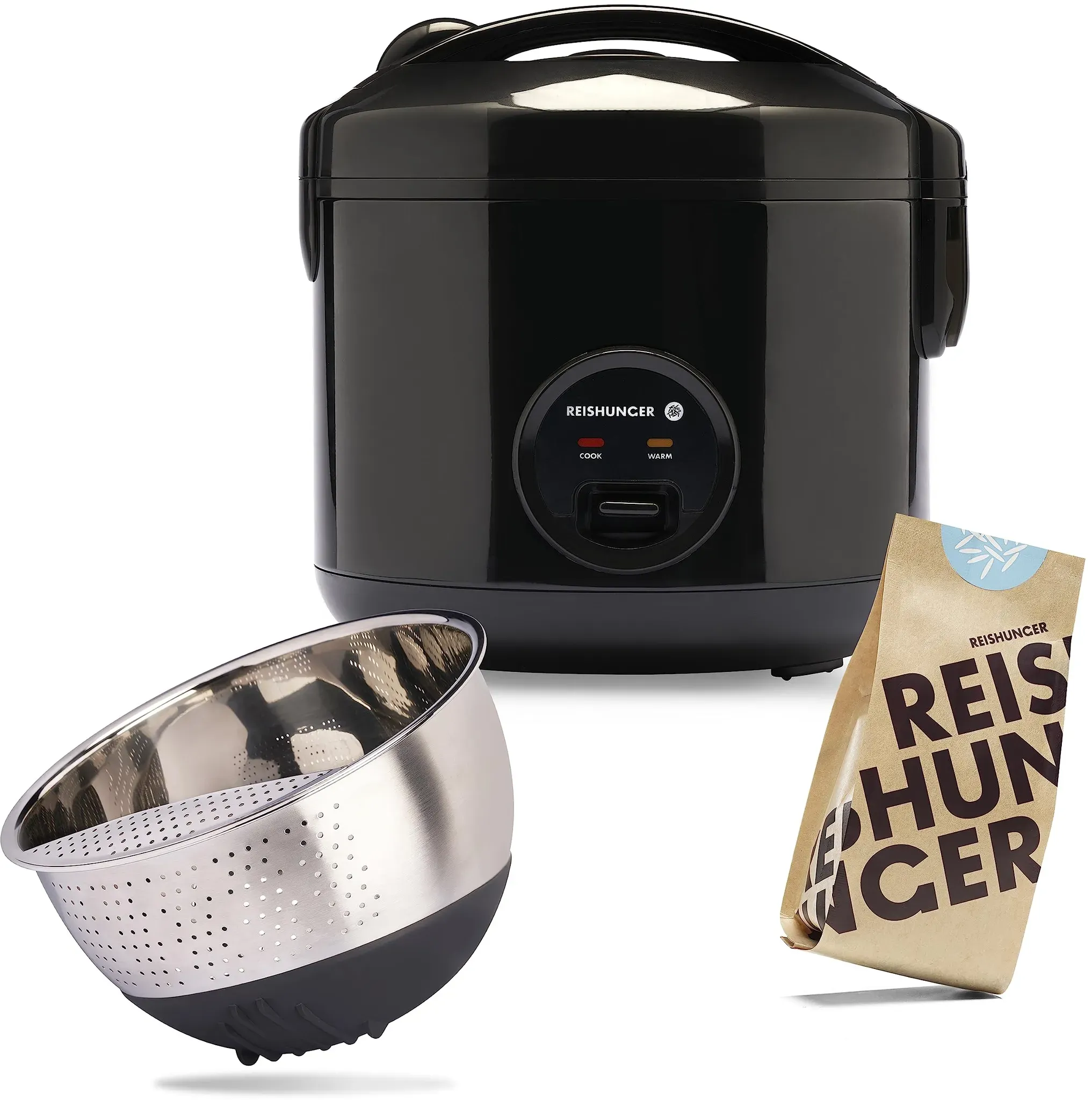 Zustand: Neu - Reiskocher - Reishunger - 533-RK-KER-BLACK REISHUNGER Reiskocher - EAN: 4260757830282 - 🚠PERFEKT GEGARTER REIS - Unser Reishunger Reiskocher ist bestens geeignet für alle möglichen Reissorten wie z. B. Sushi Reis, Duft Reis, Naturreis und Basmati Reis. Der Reiskocher schaltet sich automatisch in den Warmhaltemodus, sobald der Reis gar ist und hält diesen bis zu 8 Stunden lang warm. ðŸ½ï¸ EIN REISKOCHER FÜR ALLE - Mit einer Füllmenge von 1,2 l kann der elektrische Reiskocher bis zu 6 Portionen Reis gleichzeitig zubereiten. Er eignet sich sowohl für Familien als auch für kleine Haushalte und gart eine Portion Weißen Reis bereits in nur 15 Minuten. œ”ï¸ EINFACHE BEDIENUNG - Mit dem Reishunger Reiskocher bekommst du mithilfe einer einzigen Taste allzeit perfekt gekochten Reis. Im praktischen Dämpfeinsatz lässt sich dein liebstes Gemüse gleichzeitig dampfgaren und du hast ausreichend Zeit alle Beilagen zuzubereiten. 🔧 NATÜRLICH GS ZERTIFIZIERT - Das Kennzeichen Geprüfte Sicherheit bescheinigt, dass der Hersteller das Gerät freiwillig auf die Anforderungen des Produktsicherheitsgesetztes (ProdSG) geprüft hat. 💎 PREMIUM INNENTOPF & ZUBEHÖR - Der hochwertige Innentopf mit gesundheitlich unbedenklicher Keramikbeschichtung sorgt dafür, dass kein Reiskorn mehr am Boden kleben bleibt. Zu deiner Lieferung erhältst du einen Reislöffel, einen Messbecher und einen Dämpfeinsatz für deine Beilagen. - Verkäufer: Reishunger im amazon.de Marketplace Ein preisgünstiger Basis Reiskocher mit Keramikbeschichtung, ideal für kleinere Mengen Reis (1,2L). ![]() ![]() Reishunger Basis Reiskocher 1,2l schwarz mit keramikbeschichtetem Topf