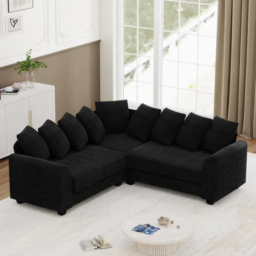 Kategorie: Sofas - Okwish - GTIN:9331813224194 - Weicher Plüschstoff:Hochwertiger Plüschbezug mit angenehmer Haptik weich, strapazierfähig und tierfreundlich für langlebigen Einsatz im Wohnzimmer. Tiefer Sitz mit Wolkengefühl: 83 cm Sitzfläche, weiche Polsterung und extra Taillenkissen für entspannte Stunden, ob beim Fernsehen oder Plaudern. Modulares Eckdesign: L-förmige Struktur mit umkehrbarem Liegeteil, flexibel anpassbar an Raumecken platzsparend und optisch klar definiert. Massivholz für Stabilität: Solides Gestell aus Massivholz trägt bis 350 kg standfest und für tägliche Nutzung im Familien- oder Gästezimmer geeignet. Reichlich Kissenkomfort: Mit 9 Kissen (je 49 49 cm), weicher Lampenplüsch-Oberfläche und neutralem Farbton schafft wohnliche Wärme im Raum. Abmessungen & DetailsProducttyp: Ecksofa Farbe: SchwarzAnzahl der Pakete : 3Material: CordFüllung: SchaumstoffStil: ModernAnwendung: WohnbereichPolstermaterial: CordArmlehnen: KissenbezugRückenlehne: KissenbezugSitzfläche: WeichAnzahl der Sitze: 5Länge (aufgebaut): 202,00Breite (aufgebaut): 202,00Höhe (aufgebaut): 74,00Gewicht (kg): 74,50Hinweise Dieses Produkt wird zur Lieferung in 3 Pakete aufgeteilt.Sie kommen möglicherweise nicht gleichzeitig an. Bitte wartegeduldig. Aufgrund manueller Messdaten kann ein Fehler von 2-3 cm auftreten. Alle Produktbilder werden mit realen Produken aufgenommen, aber aufgrund des Einflusses der Sonnenstrahlung und anderer Faktoren kann es zu bestimmten Farbunterschieden kommen. - ... ![]() ![]()