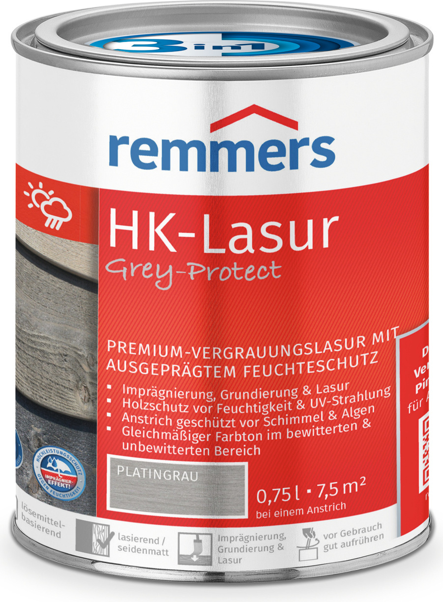 Remmers - EAN: 4004707018371 - Dekorative, lösemittelbasierte Premium-Vergrauungslasur. für außen.Einsatzgebiete:Holz außenHölzer ohne ErdkontaktNicht maßhaltige Holzbauteile: z. B. Zäune, Fachwerk, Carports, HolzverschalungenBegrenzt maßhaltige Holzbauteile: z. B. Klappläden, Profilbretter, GartenhäuserMaßhaltige Holzbauteile (nur als Grundierung): z. B. Fenster und TürenGrund-, Zwischen- und SchlussbeschichtungNicht für Beschichtung von Bodenflächen (Terrassen, Holzdecks usw.) geeignetEigenschaften:Natürliche Grautöne für Holz im FreienDauerhaft gleichmäßiger Farbton im bewitterten und unbewitterten Bereich3in1: Imprägnierung, Grundierung und LasurHolzschutz vor Feuchtigkeit und UV-StrahlungImprägniereffekt: Holzabsättigung gegen FeuchtigkeitDiffusionsoffener Schutzfilm: Feuchtigkeit kann entweichenHydrophobierend: nasse Oberflächen trocknen schnellDurch den Schutz vor Witterungseinflüssen (konstruktiver Holzschutz und Feuchteschutz des Produktes) wird das Risiko der Entstehung von Bläue und Fäulnis reduziertErhöhter Festkörperanteil bewirkt physikalisch Sicherheit gegen WespenfraßAnstrich geschützt vor Schimmel AlgenNachbehandlung ohne AnschleifenDünnschichtlasurBlättert nicht abFarbtöne sind untereinander mischbarDaten:Verbrauch: Ca. 100 ml/m je Arbeitsgang, mindestens 2 Anstriche erforderlich. Gehobelte oder sehr dichte Hölzer sind weniger saugfähig und benötigen ggf. einen 3. AnstrichHinweise zur Verarbeitung siehe Technisches MerkblattInhaltsstoffe und ... Hornung- baushop.de Remmers HK-Lasur 3in1 Grey-Protect, silbergrau (RC-970), 0.75 l