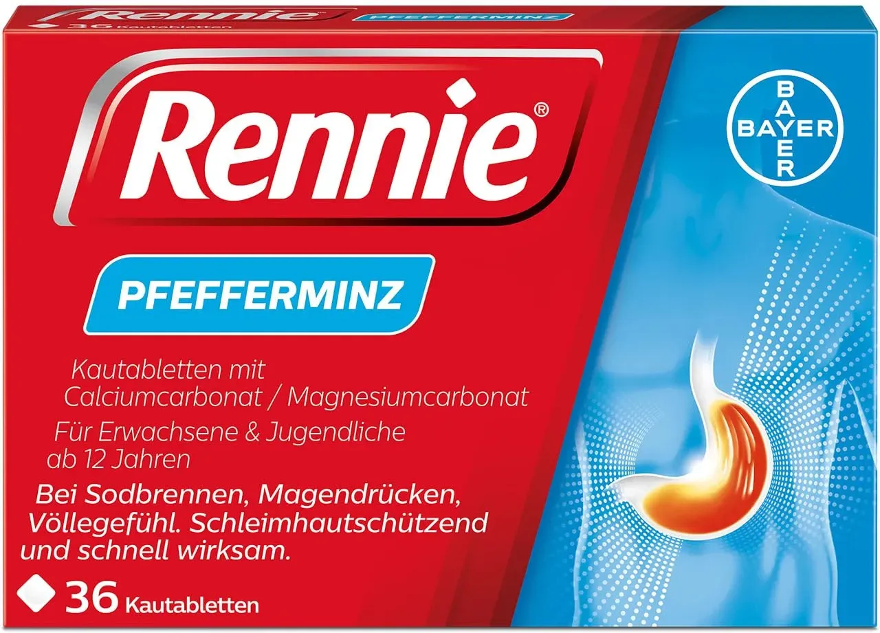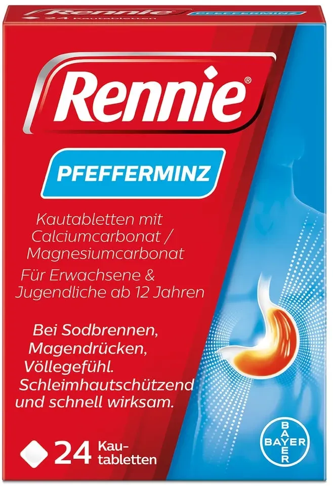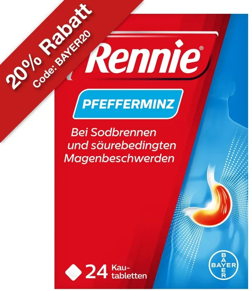 Kategorie: Arzneimittel - Rennie - GTIN:4150014596115 - Lindern Sodbrennen und säurebedingten Magenbeschwerden bereits nach ein bis zwei Kautabletten (1) Wandeln überschüssige Magensäure in Wasser und andere natürliche Substanzen um Auch zur Einnahme während der Schwangerschaft geeignet Enthalten kein Aluminium Schmecken frisch nach Pfefferminze - 12,41 Euro bei Amazon Marketplace Health & Personal Care - gefunden von billiger.de Für 13.49 Euro erhalten Sie hier eine solide Packungsgröße, die ein gutes Preis-Leistungs-Verhältnis bietet. ![]() ![]() Bayer Rennie Pfefferminz gegen Sodbrennen Kautabletten