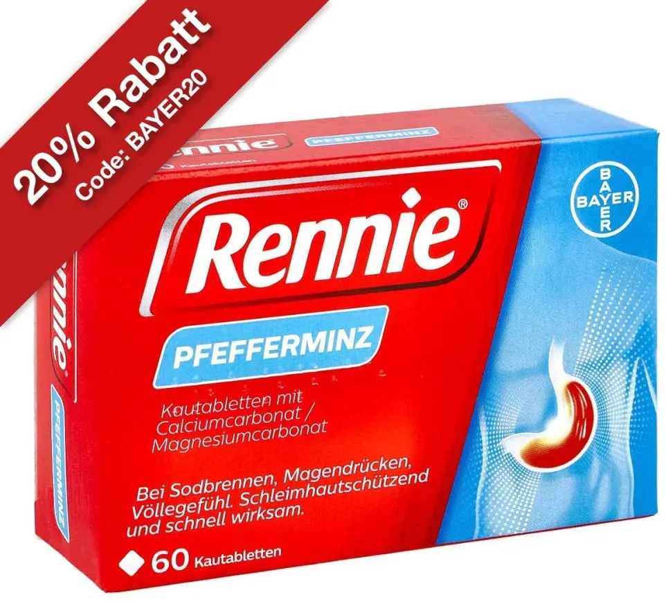 0,17 /St - Kategorie: Arzneimittel - Bayer - GTIN:4150166648021 - PZN:16664802 - Rennie Pfefferminz 96 St - rezeptfrei - von Bayer Vital GmbH Geschäftsbereich Selbstmedikation - Kautabletten - 96 St - 15,99 Euro bei DocMorris Apotheke - gefunden von billiger.de Mit 16.01 Euro für 96 Kautabletten ist dies ein attraktives Angebot für eine größere Packung. ![]() Rennie Kautabletten 96 St