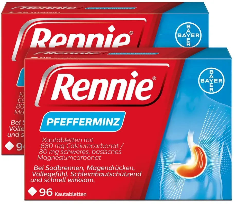 2 Händlerangebote bei billiger.de - Kategorie: Medizinischer Bedarf - Bayer - Rennie Pfefferminz Kautabletten: Schnelle Hilfe bei SodbrennenRennie Pfefferminz Kautabletten lindern schnell Sodbrennen oder säurebedingte Magenbeschwerden. Die Besserung tritt rasch und bereits nach der Einnahme von ein bis zwei Kautabletten ein. Rennie Pfefferminz Kautabletten wandeln überschüssige Magensäure in Wasser und andere natürliche Substanzen um. Sie sind außerdem auch während der Schwangerschaft anwendbar, da sie sehr gut verträglich sind. Ein weiteres Plus: Die Kautabletten schmecken angenehm nach Pfefferminze.Der Klassiker gegen Sodbrennen: Rennie Pfefferminz KautablettenKennen Sie das auch: Nach dem Essen oder nachts im Liegen brennt und sticht es auf einmal hinter Ihrem Brustbein. Häufig wird die Beschwerde noch von saurem Aufstoßen oder einem Druckgefühl im Oberbauch begleitet. Schuld am Sodbrennen ist die Magensäure. Eigentlich fungiert der Schließmuskel zwischen Speiseröhre und Magen als eine Art Türwächter, um die Magensäure am Aufstieg zu hindern. Es kann aber beispielsweise zu sogenannten spontanen Erschlaffungen kommen. Doch auch bei erhöhtem Druck im Bauchraum, zum Beispiel in der Schwangerschaft oder nach bestimmten insbesondere hochkalorischen und fetthaltigen Mahlzeiten, kann es häufiger zum übertritt von saurem Mageninhalt in die Speiseröhre kommen.Machen Sie sich in diesem Fall keine Sorgen es gibt schnelle Hilfe: Rennie Pfefferminz Kautabletten. Sie lindern Sodbrennen ... Das Doppelpack mit 2x96 Kautabletten für 36.75 Euro ist eine kostengünstige Option für Langzeitnutzer. ![]() Rennie Kautabletten Doppelpack 2x96 St