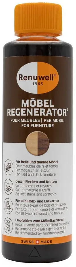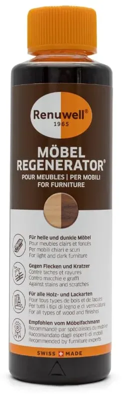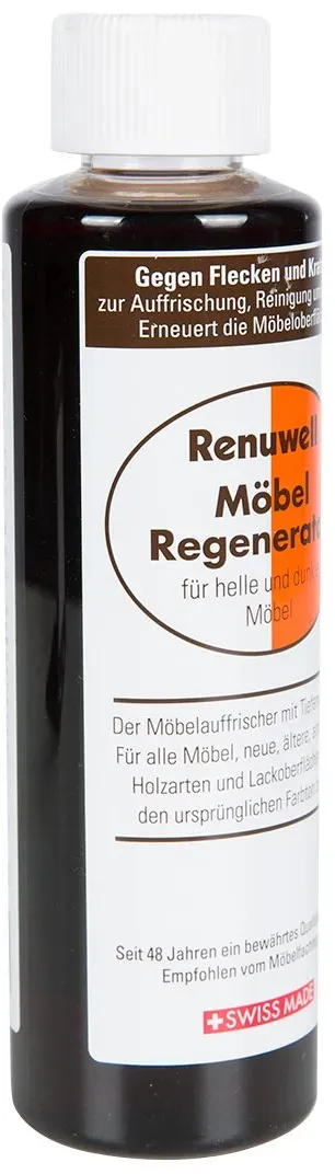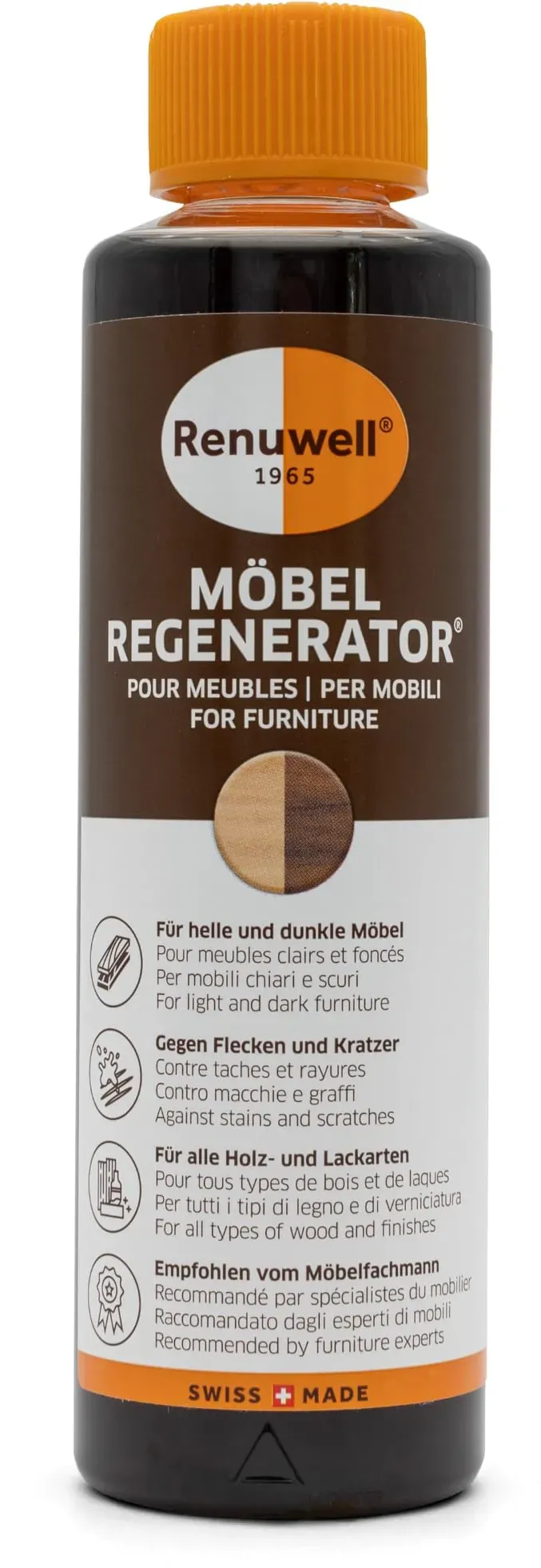 Kategorie: Reinigungsmittel - Renuwell - 270ml Gebinde für helles und dunkles Holz - 10,41 Euro bei Amazon Marketplace Home Improvement - gefunden von billiger.de ![]() ![]() Renuwell Möbel-Regenerator, 270 ml ? Intensive Pflege und Regeneration für Holzmöbel und Oberflächen, entfernt Wasserflecken, Kratzer & Hitze-Ringe, Schweizer Qualitätsprodukt