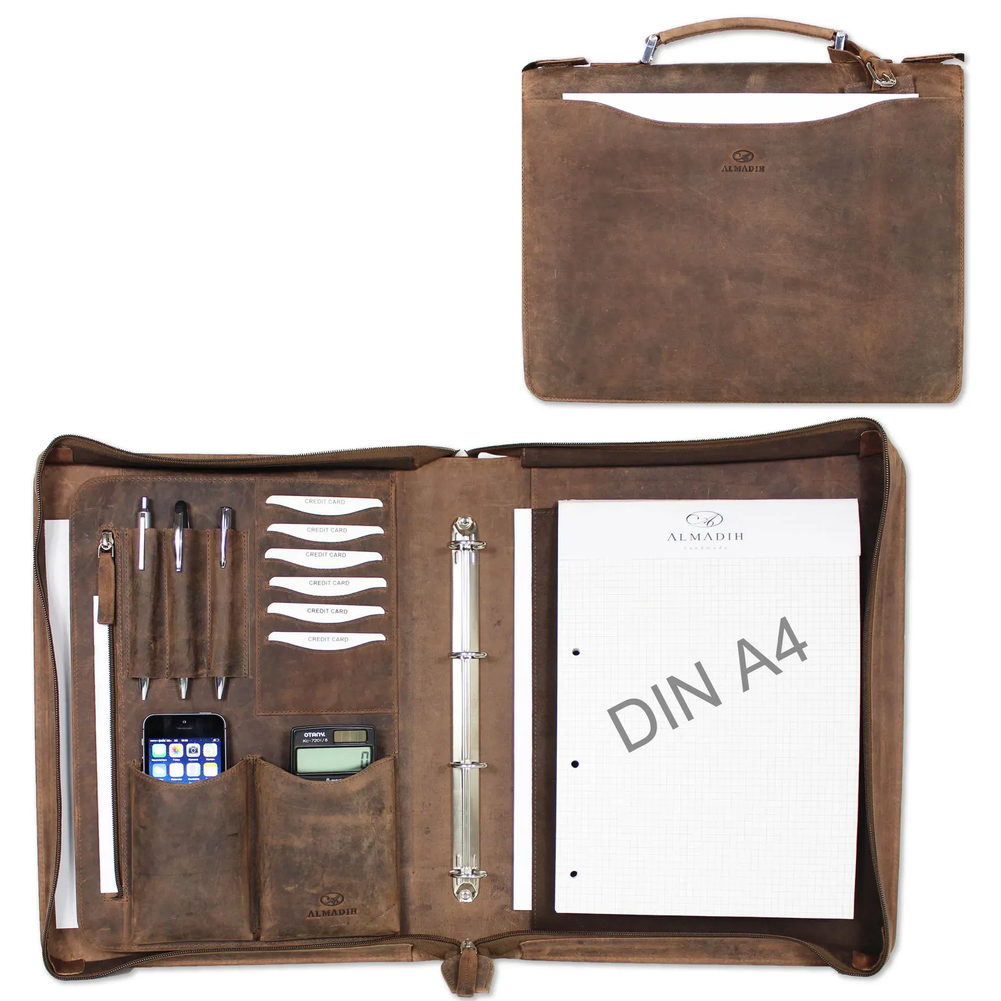 Kategorie: Ordner - Pride and Soul - GTIN:4021068301256 - Die PRIDE AND SOUL Tablettasche VIGGO aus strapazierfähigem Echtleder ist ein multifunktionales edles Leder-Accessoire für den Geschäftsalltag, auf Reisen und in der Freizeit Die durchdachte Konferenzmappe verfügt auf der linken Seite über ein gepolstertes Tabletfach, 6 Visitenkartenfächer, 2 Stiftschlaufen, 1 Reißverschluss- und 1 Dokumentenfach sowie ein Bänderfach Auf der rechten Seite befindet sich ein DIN A4 Schreibblock, welcher in einem Einschubfach angebracht ist und so leicht gewechselt werden kann. In der Mitte befindet sich eine 4 Ring Mechanik Die Dokumentenmappe im DIN A4 Format ist mit einem umlaufenden Doppel-Reißverschluss ausgestattet. Ein robuster Tragegriff sorgt für einen angenehmen Transport von Unterlagen und Dokumenten Mit eleganter Pride and Soul Prägung, Außenmaße: ca. 35,5 x 28 x 5 cm, Innenmaß Laptopfach: 32 x 21 x 2 cm, Gewicht: 910 g, Material: Leder, Farbe: Braun, Art.Nr.: 30125, EAN: 4021068301256 - 90,80 Euro bei Amazon Marketplace Automotive - gefunden von billiger.de Diese luxuriöse Aktenmappe aus Rindsleder bietet höchste Qualität und Funktionalität für anspruchsvolle Nutzer. ![]() ![]() ALMADIH Leder Aktenmappe A4 mit Ringbuch, Reißverschluss + Tragegriff Rindsleder Braun Vintage Ledermappe Mappe Konferenzmappe Dokumentenmappe Ringbuchmappe Tagungsmappe Organizer (A4 Aktenmappe BV)
