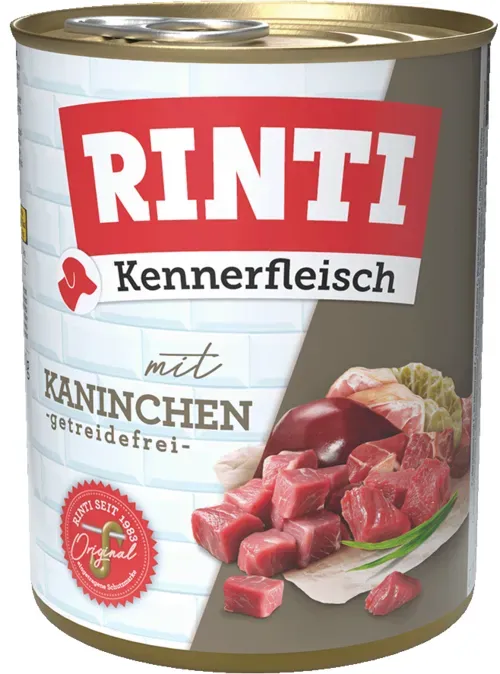 Rinti - EAN: 4000158910714 - RINTI KENNERFLEISCH Getreidefrei - Fleisch pur - ohne Kohlenhydrate Hoher Fleischanteil: mit 70% Fleisch und Innereien (Ausnahme Sorte Pansen: 68% Pansen) ist Rinti Kennerfleisch reich an natürlichen Fleischstücken - und die Stücke zeichnen das echte Rinti Kennerfleisch aus.Plus Omega 3: diese mehrfach ungesättigten Fettsäuren werden zur Unterstützung der Abwehrkräfte und des Zellschutzes eingesetzt. Flachsöl ist reich an Omega 3. Plus Rübenfaser: reich an Ballaststoffen - wirkt sich regulierend auf die Verdauung aus.ZusammensetzungRind (35%), Lunge, Muskelfleisch, Schwarten, Niere, Mineralstoffe, Flachsöl (0,2%), Rübenfaser (0,2%). AnalyseRohprotein 11,0%Fettgehalt 8,0%Rohfaser 0,6%Rohasche 2,5%Feuchtegehalt 77,0%Calcium 0,30%Phosphor 0,25%Zusatzstoffe (pro kg)Vitamin D3: 200 I.E.Vitamin E (als all-rac alpha-Tocopherylacetat): 40mgZink (als Zinkoxid): 30mgFütterungsempfehlungGewicht bis 8 kg: ca. 400g pro Tag,bis 20 kg: ca. 800g pro Tag.Kann nach Rasse, Aktivität und Alter des Hundes variieren. - bei futterplatz.de - aus Yadore Produktdaten Ein 12er-Paket mit Kaninchen, eine gute Option für Hunde mit empfindlichem Magen oder Allergien. ![]() ![]() Rinti Kennerfleisch Kaninchen | 12x 800g Nassfutter Hunde