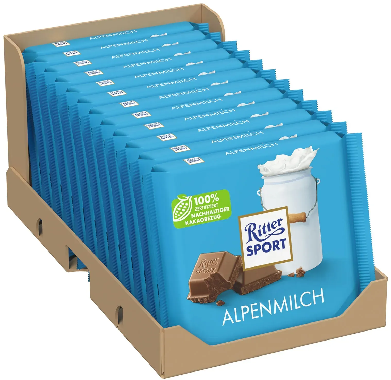 Verfügbarkeit: 5 Werktage - 19.90 / kg - Kategorie: Schokolade - Ritter Sport - GTIN:4000417620668 - Nie wieder schleppen €“ jetzt im Vorratspack genießen! Zwei starke Marken kombiniert in einer Limited Edition mit einem modernen und farbenfrohem Design. - 23,88 Euro bei netto-online.de - gefunden von billiger.de ![]() ![]() Ritter Sport Alpenmilch Schokolade 100 g, 12er Pack