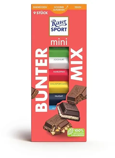 Kategorie: Schokolade - Ritter Sport - GTIN:4000417119605 - Ritter Sport Mini Farbenfroher Mix 150 g ist ein Schokoladen-Snack mit Haselnüssen, Mandeln, Milch und Soja, mit hohem Zuckergehalt und Fettgehalt. Er wird mit nachhaltig beschafften Zutaten hergestellt und kann Spuren anderer Nüsse, Eier oder Erdnüsse enthalten. - 3,49 Euro bei Joybuy - gefunden von billiger.de Die Voll-Nuss Schokolade im 10er Pack ist ein Bestseller und bietet einen guten Vorrat für Nuss-Liebhaber. ![]() ![]() Ritter Sport Voll-Nuss (10 x 100 g), Vollmilchschokolade mit ganzen Haselnüssen, knackig geröstet, hochwertige Nuss-Schokolade