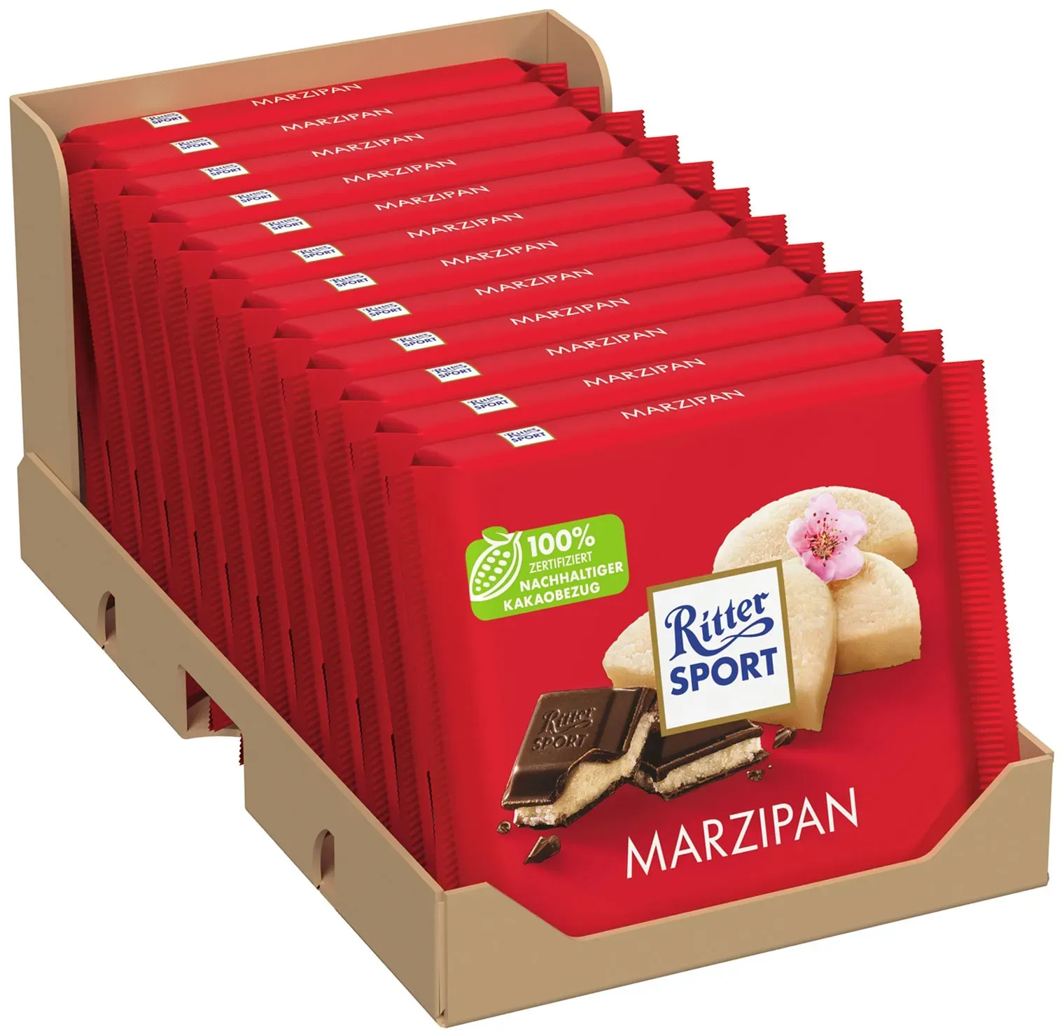 Verfügbarkeit: 5 Werktage - 19.90 / kg - Kategorie: Schokolade - Ritter Sport - GTIN:4000417601865 - Immer griffbereit aus der praktischen Großpackung! Schon der Name verrät es: Hier handelt es sich um Schokolade auf hohem Niveau. Ein spezielles Conchierverfahren verleiht der Mischung aus Alpenmilch und Kakao ihr charakteristisches Karamell- und Honigaro - 23,88 Euro bei netto-online.de - gefunden von billiger.de ![]() ![]() Ritter Sport Marzipan Schokolade 100 g, 12er Pack