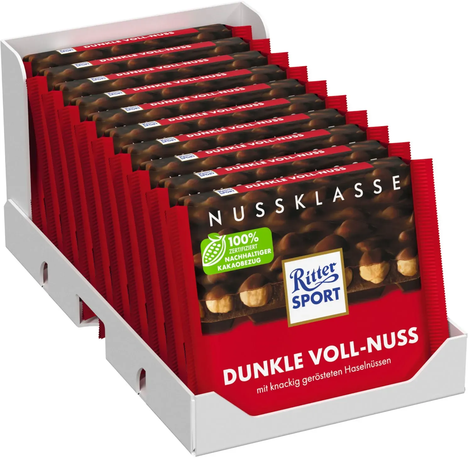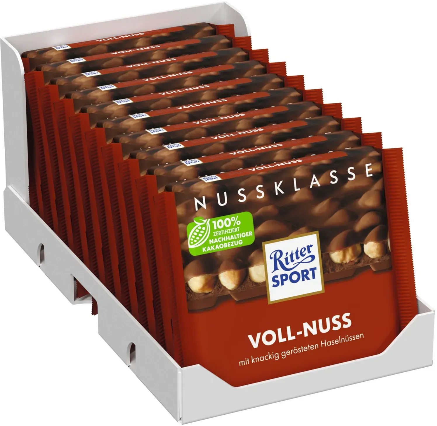 Zustand: Neu - 18,92 € / kg - Riegel Schokoladenriegel - Ritter Sport - P000000000000550624 - EAN: 4000417018601 - Schokolade Tafelschokolade Süsswaren - Verkäufer: FriFro im amazon.de Marketplace ![]() ![]() Ritter Sport Voll-Nuss (10 x 100 g), Vollmilchschokolade mit ganzen Haselnüssen, knackig geröstet, hochwertige Nuss-Schokolade