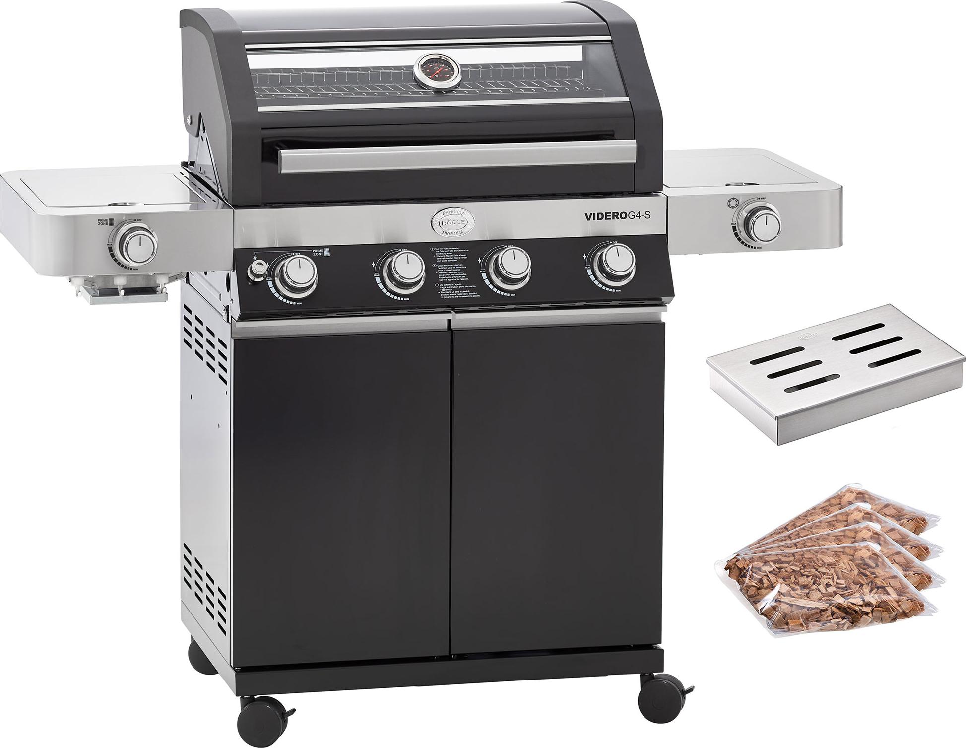 lieferbar-in 5-6 Werktagen bei dirRöSLE Gasgrill RöSLE BBQ Gasgrill Videro G4-S Vario+ Schwarz mit Räucherset
