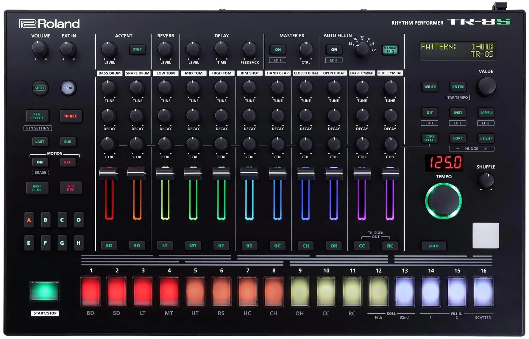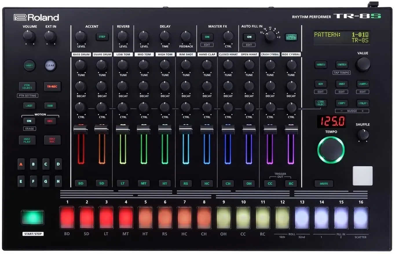 Zustand: Neu - Controller für digitale Audio-Workstations - Roland - TR-8S - EAN: 4957054512118 EAN: 0736724294448 EAN: 0663185955604 EAN: 0736724310193 EAN: 0761294512111 EAN: 0632317256568 - Moderne Drum Machine mit den berühmtesten TR-Drumsounds aller Zeiten. Mit authentischen Nachbildungen der 808, 909, 707, 727 und 606 Drum Machines. Inklusive CR-78 CompuRhythm, dem unmittelbaren Vorgänger der TR-808. Auf Basis der renommierten ACB-Technologie. Optimiere Sounds mit speziell für perkussive Inhalte abgestimmten Effekten. Speichere 128 Patterns, jedes davon mit acht Variationen und drei Fills. 128 integrierte Kits. - 6 Händler im amazon.de Marketplace Die Roland TR-8S ist hier zu einem Standardpreis erhältlich und bietet die volle Bandbreite an klassischen und modernen Drum-Sounds. ![]() ![]() Roland TR-8S Rhythm Performer | Moderne Drum Machine mit klassischen TR-Drumsounds inkl. TR-808, TR-909, TR-707, TR-727, TR-606 & CR-78 | ACB-Technologie | 128 Kits | Anpassbare Effekte