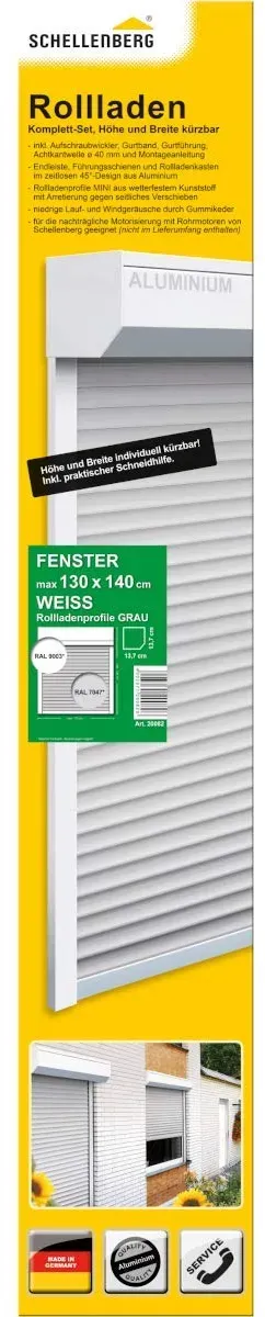 5 Händlerangebote bei billiger.de - Kategorie: Rollläden & Zubehör - Schellenberg - Rolladenpanzer aus leichten PVC-Lamellen, für enge Platzverhältnisse ideal für die Renovierung oder Neubau Breite individuell kürzbar, Höhe erweiterbar gegen seitliches Verschieben arretiert Set inkl. Rolladen-Aufhängefedern, Alu-Endleiste und Rolladenstopper - GTIN:4003971390022 Ein sehr preiswerter PVC-Rolladenpanzer in Mini-Ausführung, ideal für kleinere Fenster und Budgets. ![]() ![]()