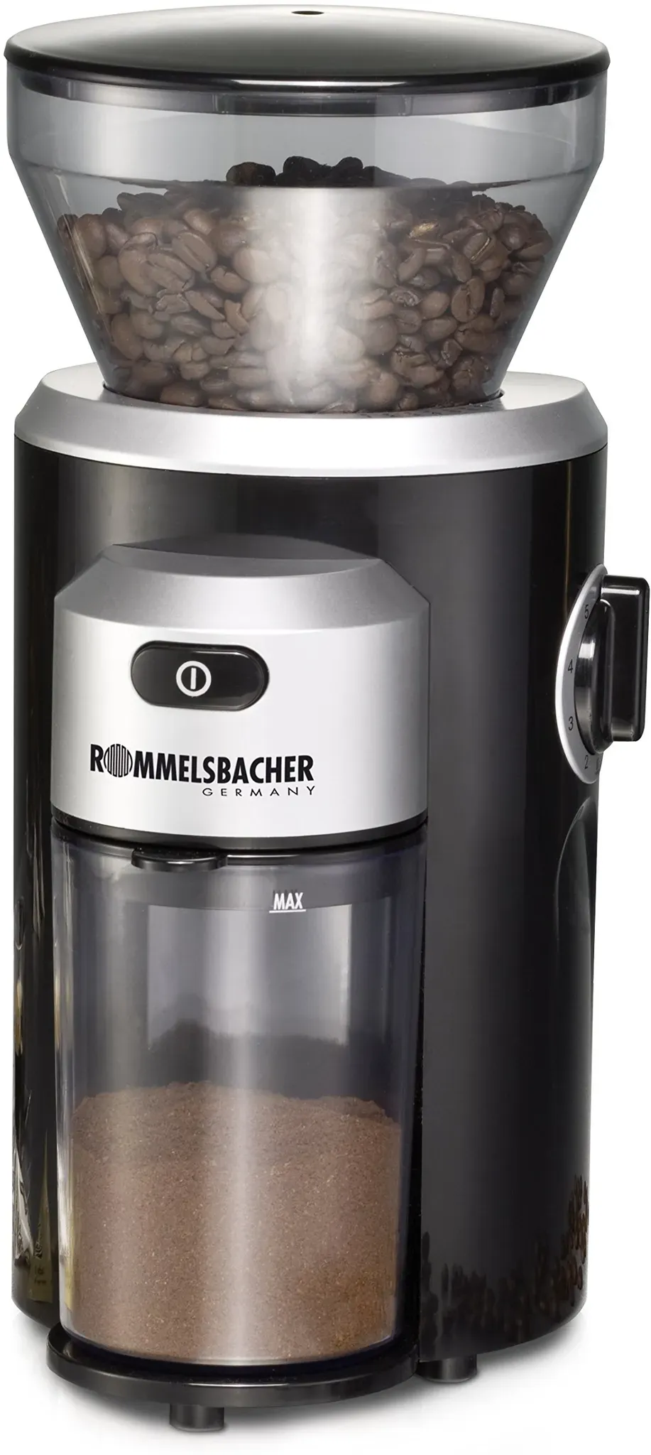 Auf Lager Versand durch AmazonROMMELSBACHER Kaffeemühle EKM 400 - Kegelmahlwerk, Antistatik-Funktion, 12 Portionen, Halterung für Siebträger, Mahlgrad in 35 Stufen, Bohnenbehälter 220 g, Pulverbehälter, 130 Watt