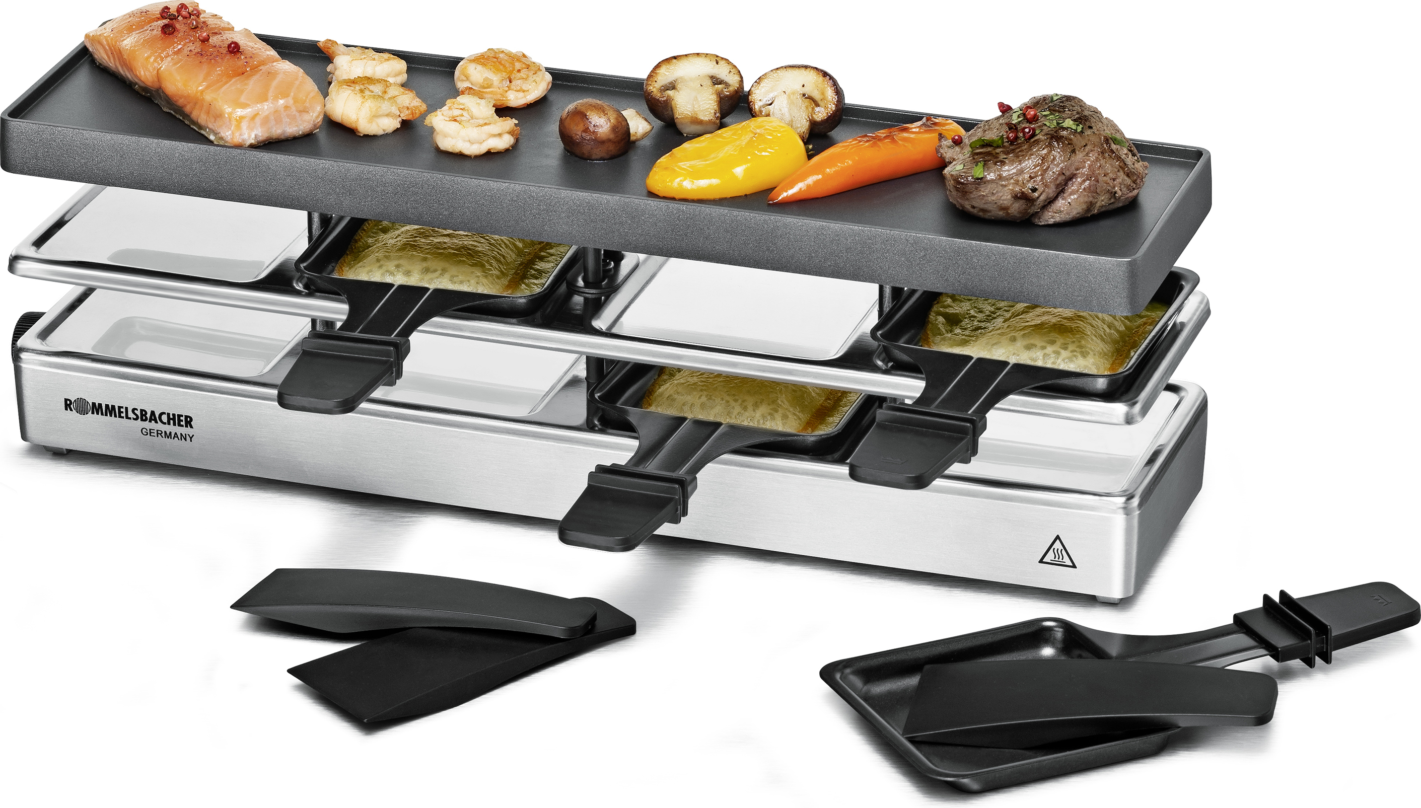 Auf Lager Versand durch AmazonROMMELSBACHER RC 1600 Raclette-Grill fun for 4+4 (Tischgrill, für 8 Personen, erweiterbar, Parkdeck, Alu-Druckguss-Grillplatte mit Xylan Plus Antihaftbeschichtung, 1460 W) silber