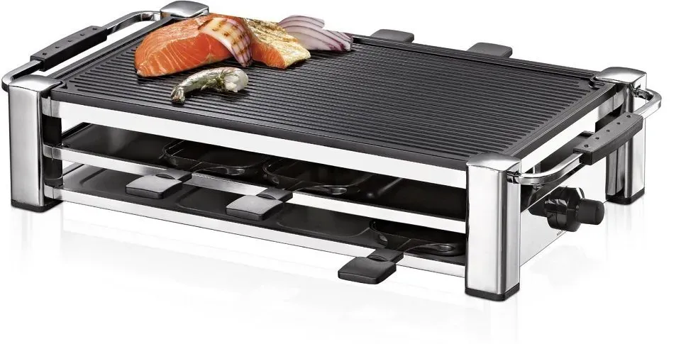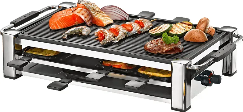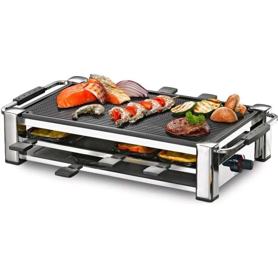 Auf Lager Versand durch AmazonROMMELSBACHER RCC 1500 Raclette-Grill (extra langes Kabel (2m), Tischgrill für 8 Personen, gerippte Alu-Druckguss-Grillplatte, Xylan Plus Antihaftbeschichtung, Parkdeck, 1500 W) chrom