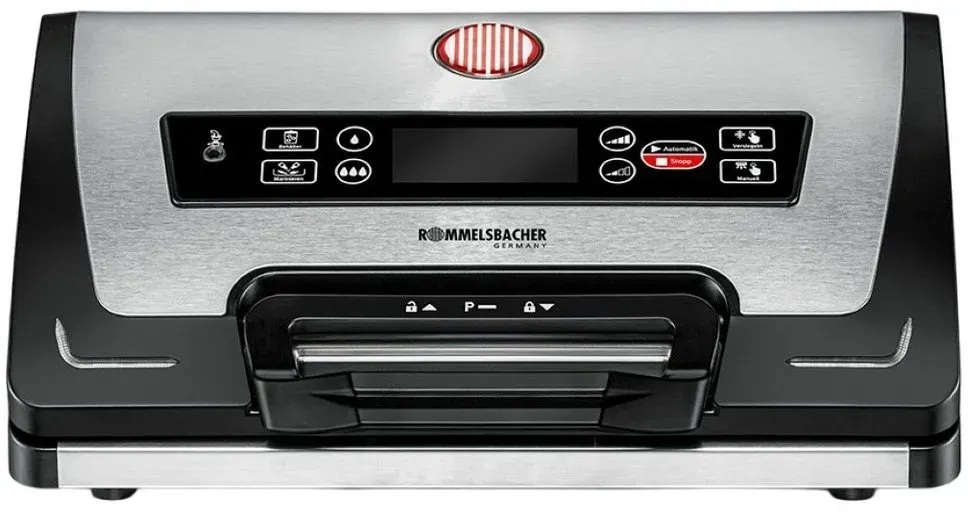 Kategorie: Vakuumierer - Rommelsbacher - GTIN:4001797829306 - Vakuumiergerät für Folien und Behälter Bedienung über Touch Control Sensoren hochwertige, leistungsstarke Kolbenpumpe geeignet für druckempfindliche Lebensmittel Inklusive: 10 Folienbeutel, Schneidmesser, Vakuumierschlauch - 198,90 Euro bei Cyberport - gefunden von billiger.de ![]() smartgoods .de Rommelsbacher Vakuumierer VAC 585 | Folienschweißgerät | Edelstahl Schwarz | 30 cm Folienbreite | 250 W