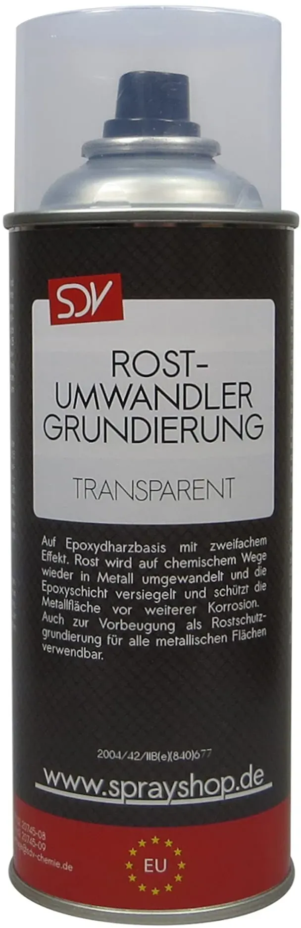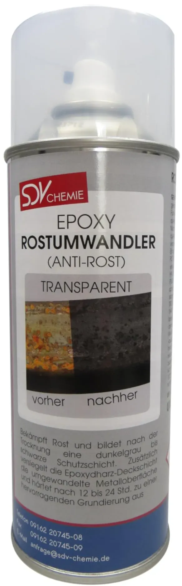 Kategorie: Autoreinigung & Pflege - SDV Chemie - GTIN:4260226833004 - SDV Chemie ROSTUMWANDLER ist ein hochwertiger, chemisch wirkender Rostumwandler auf Epoxydharzbasis mit zweifachem Effekt. Rost wird auf chemischem Wege wieder in Metall umgewandelt und die Epoxyschicht versiegelt und schützt die Metallfläche vor weiterer Korrosion. Anti-korrosiv, zuverlässiger Rostschutz und Rostumwandler Rostschutz und Grundierung in einem Arbeitsgang verhindert weitgehend erneute Korrosion überlackierbar mit den meisten Lacken und Farben - 6,70 Euro bei Amazon Marketplace Home Improvement - gefunden von billiger.de Dieses SDV Chemie Rostumwandler Spray ist eine günstige Einzelpackung, die Rost saniert und grundiert. ![]() ![]() SDV Chemie Rostumwandler Spray 1x 400ml Anti Rostspray 2in1 Rostsanierer und Grundierung