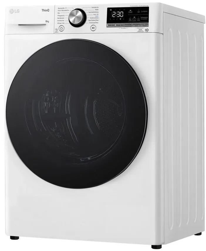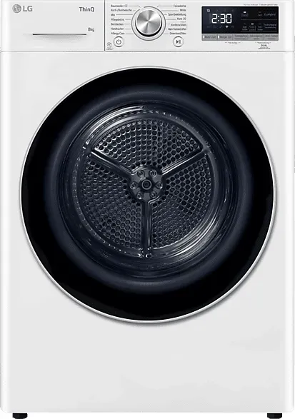 EEK: C - Kategorie: Wärmepumpentrockner - LG - GTIN:8806084132338 - Produktdetails Bauart , Wärmepumpentrockner, Farbe , Weiß, Top-Feature Top-Features , Allergy Care Automatisch selbstreinigender Kondensator Dual Inverter Wärmepumpentechnologie ECO Hybrid System Reversive Trommel Sensor Dry Smart Diagnosis Smart Pairing ThinQ App-Kompatibilität Umkehrbare Tür, Technische Daten Lieferumfang , TrocknerBedienungsanleitungKondenswasser-Ablaufschlauch und Schlauchhalterung, Absicherung , 16 A, Anschlusswert , 2,1 kW, Material Trommel , Edelstahl, Spannung , 220-240 V, Leistung & Verbrauch Modellbezeichnung , RT80V9W, Kondensationseffizienzklasse , B, Energieeffizienzklasse (Skala) , C (A bis G), Gewichteter Energieverbrauch pro Trocknungszyklus , 0,96 kWh, Kondensationseffizienz , 91 %, Luftschallemissionen , 62 dB(A), Luftschallemissionsklasse , B, Ausstattung & Funktionen Programme , Allergy Care Baumwolle+ Bettdecken Download / Neu Feinwäsche Handtücher Koch-/Buntwäsche Korbtrocknen Kurz 30 Mix Pflegeleicht Sportbekleidung Warm Trocknen / Lüften Wolle, Tür , Glastür, Zeitanzeige , Endzeitvorwahl Restlaufanzeige Startzeitvorwahl, Zusatzausstattung , LED-Trommelbeleuchtung, Zusatzfunktionen , Kindersicherung Knitterschutz Trommelinnenbeleuchtung, Maße & Gewicht Höhe , 85 cm, Breite , 60 cm, Tiefe , 66 cm, Gewicht , 56 kg, Product Compliance WEEE-Reg.-Nr. DE , 12997533, Hinweise Sprachen Bedienungs-/Aufbauanleitung , Deutsch (DE), Informationen zur Datennutzung (nach EU Data ... Lidl.de LG Wärmepumpentrockner, »RT80V9W«, 8 kg