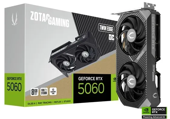 Kategorie: Grafikkarten - Inno3D - GTIN:8886307701169 - Grafikkarte, NVIDIA GeForce RTX 5060 (Core clock 2280 MHz / Boost clock 2497 MHz), 3840 CUDA Kerne, unterstützt NVIDIA DLSS 4, 8GB GDDR7 (Memory clock 28 GHz) - 128-bit, PCI-Express 5.0 x16 (x8 mode), 3 x DisplayPort 2.1a / 1 x HDMI 2.1b Verbindungen, Stützen NVIDIA G-Sync, 1 x 8-Pins Netzanschluss, empfohlenes Netzteil: 550 Watt, kurze Länge: 225mm, PCI-Port-Breite: 2.1 slots, Inno3d Twin X2 low noise kühler - mit Lüftermodus mit Null U/min (bei niedriger Temperatur), modell-Nr: N50602-08D7-195071N - 299,00 Euro bei Proshop.de - gefunden von billiger.de Die Zotac GeForce RTX 5060 Twin Edge OC ist eine kompakte und preiswerte Option für kleinere Gehäuse. ![]() ![]() Zotac GeForce RTX 5060 Twin Edge OC - 8GB GDDR7 RAM - Grafikkarte