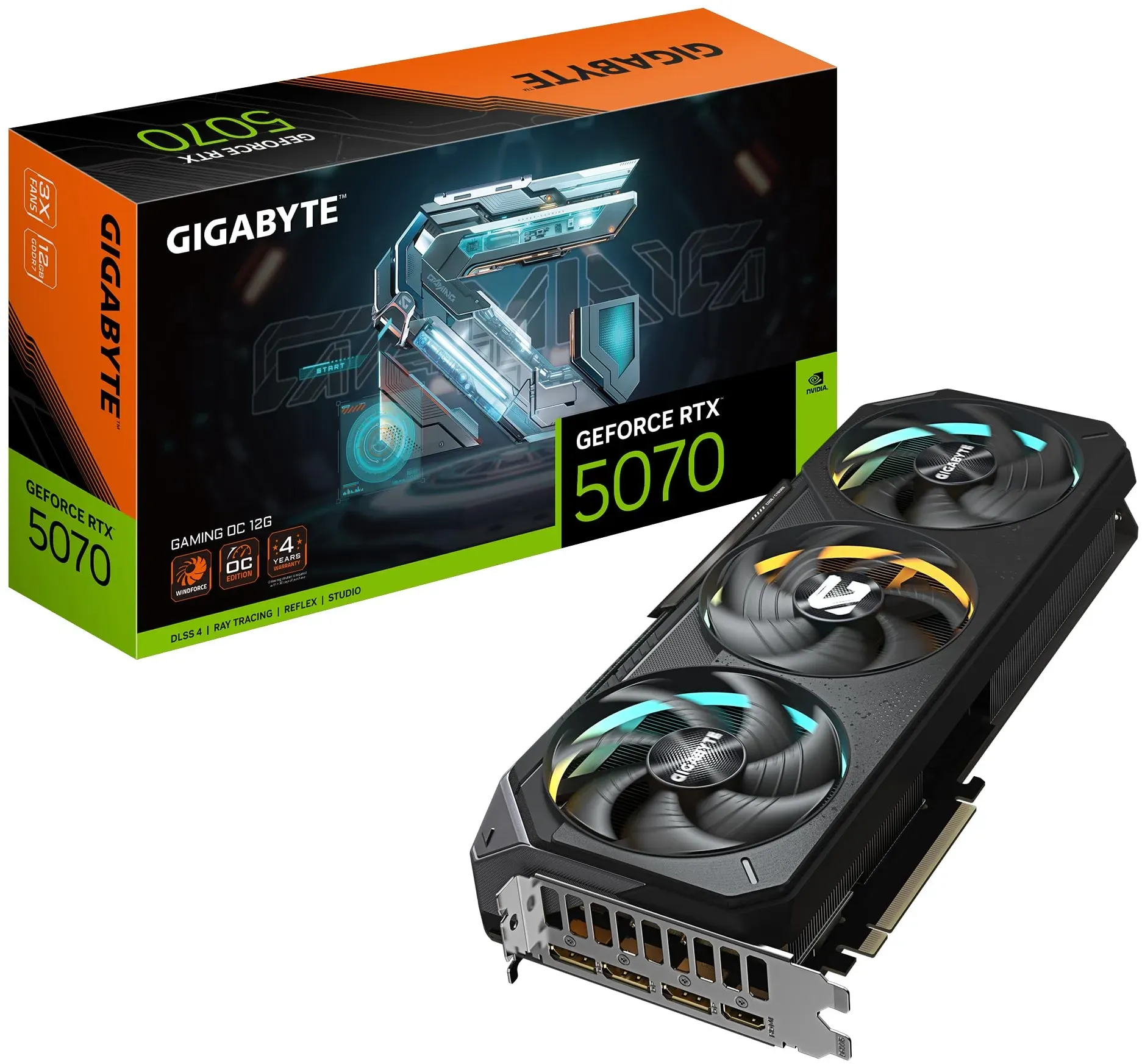 Steckkarte Grafikkarte Grafikkarten - EAN:4719331355760 - Die GIGABYTE GeForce RTX 5070 EAGLE OC SFF 12G ist eine High-End-Grafikkarte mit der GeForce RTX 5070 GPU von NVIDIA. Die leistungsfähigen GeForce RTX 50-Grafikkartenserie basiert auf der NVIDIA Blackwell Architektur und bietet neue Stufen von Gaming Realismus, Geschwindigkeit und Leistungseffizienz, AI Features wie Frame Generation, Multi Frame Generation und realistische VR-Erlebnisse. Weitere Features sind Real-Time Ray Tracing, Ray-Reconstruction, NVIDIA Ansel, mit umfangreichen Werkzeugen zur Erstellung von Screenshots in Spielen sowie NVIDIA G-SYNC, G-SYNC HDR, NVIDIA DLSS 4, ShadowPlay, Highlights, NVENC Gen 9, AV1 Encoder und Decoder. Die GeForce RTX 5070 GPU verfügt über 6144 CUDA Cores. Der 12 Gbyte große GDDR7-Speicher verfügt über einen 192-Bit-Speicherkontroller. - gefunden von Kelkoo Die MSI Gaming Trio OC bietet eine verbesserte Kühlung und Übertaktungspotenzial. ![]() ![]() MSI GeForce RTX 5070 12G GAMING TRIO OC, Grafikkarte